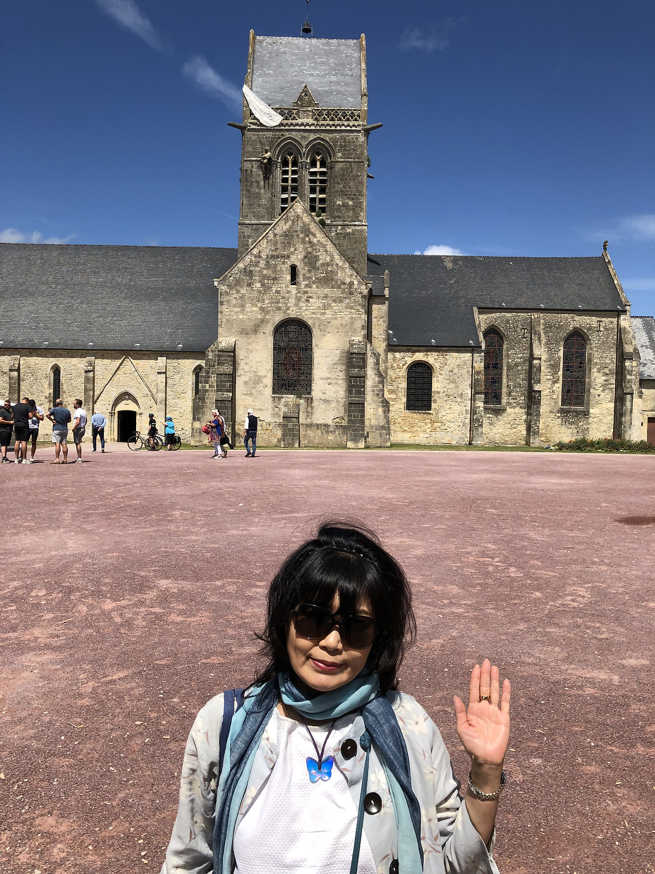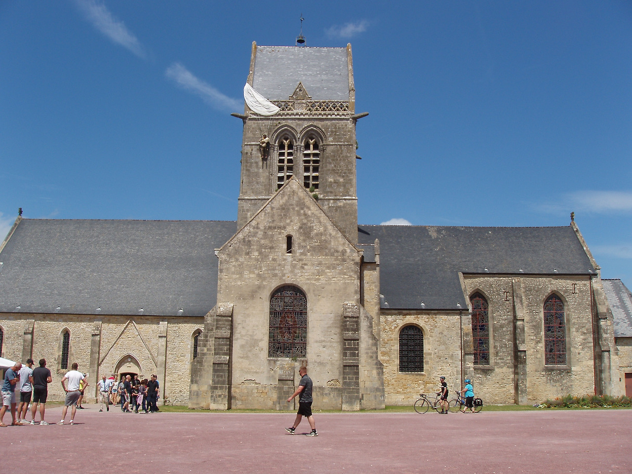 제일 먼저 우리 두 사람을 반기는 건 영화 속의 명소인 생트 메흐 에글리즈의 노트르담 성당, 광장을 가로질러 가까이 가보니 교회 종탑에 정말 낙하산 하나가 매달려 있다. 전쟁 중 교회 종탑에 낙하산이 걸려 2시간 동안 매달려 있을 수밖에 없었던 존 스틸 미 공수부대원에게 경의를 표하기 위함이다.