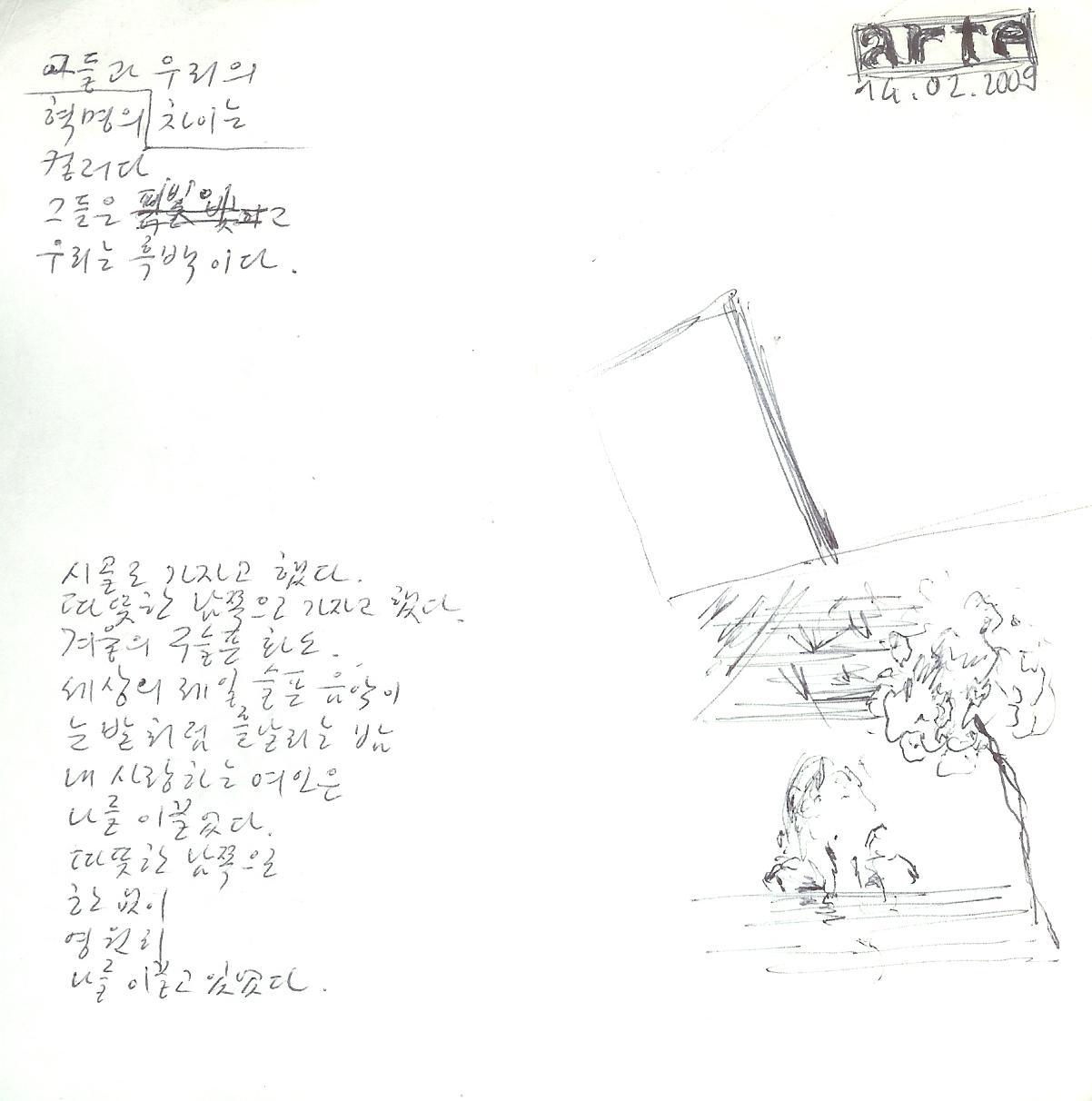 노트엔 수줍은 고백도 있다. 오다가다 만난 어느 상냥한 이에게서 받은 친절을 잊을 길 없어 노트에 대신 감사의 인사말을 적어 넣을 때도 있다. 하지만 대부분의 여백에는 어느 모퉁이에서 마주친 이름 모를 꽃과 바다가 한눈에 내려다보이는 곶에서 마주한 바람, 밀물져 오는 파도를 타고 허공으로 날아올랐다 다시 바다를 향해 뛰어드는 갈매기 떼, 길을 밝혀주는 이정표, 수없이 비와 바람을 견디며 홀로 외롭게 서있는 등대, 저 먼바다 너머의 세상엔 또 누군가 여행자를 닮은 사람이 고독하게 길을 걸어가고 있을 구릉이 펼쳐져 있음을 기록해 갈 것이다.
