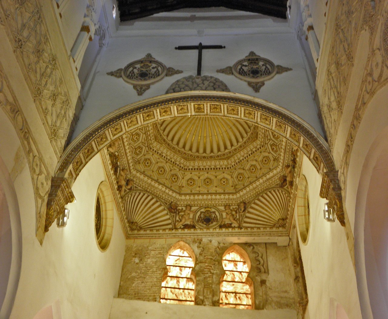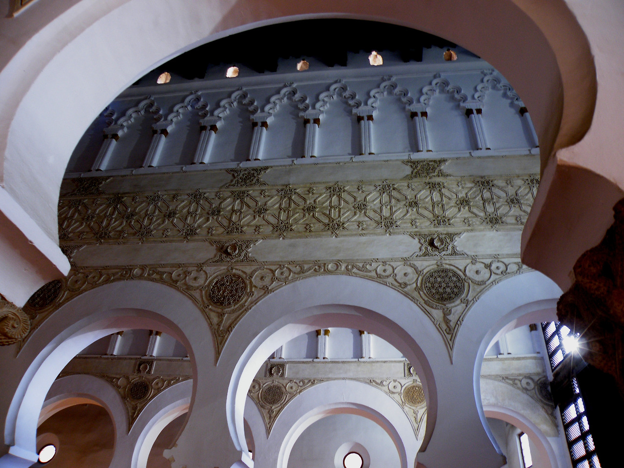 더하여 공들여 제작한 나무로 만든 천장들은 탄성을 자아내게 만듭니다. 원보다는 작고 반원보다는 큰 형태의 아치들과 여러 장의 꽃잎 모양의 문양들을 활용한 파사드 장식은 안쪽 벽이 막힌 단순한 형태를 이루면서 서로 교차하는 형태를 띤 아케이드들과 함께 무데하르 장식 술을 특징짓고 있죠.