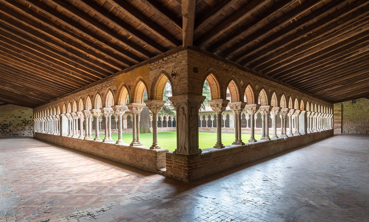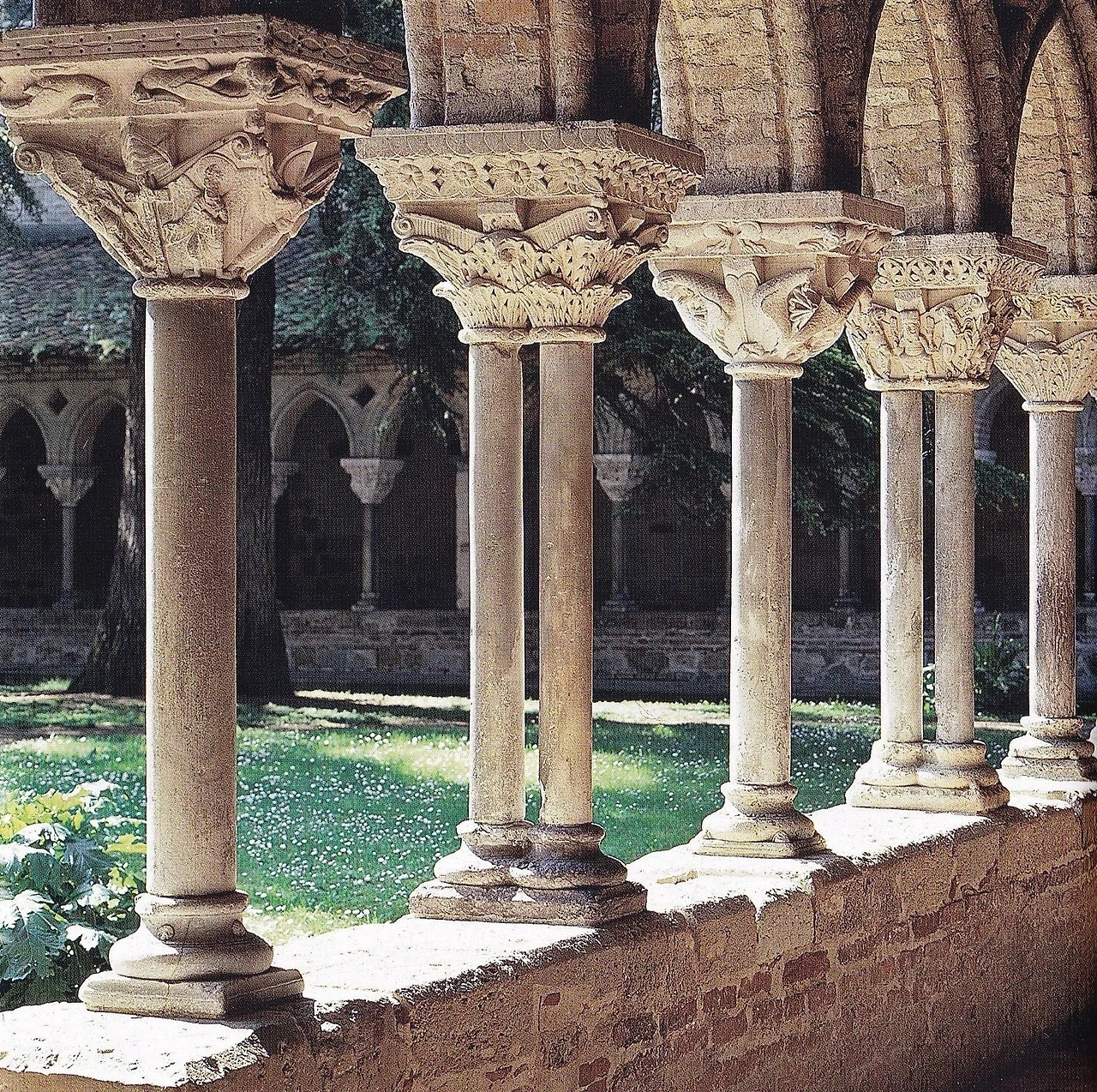 무와싹 수도원 안뜰은 1100년 앙끼틸 수도원장 재임 시에 완공되었습니다. 대리석으로 조각된 76개의 기둥머리가 파손되지 않은 채로 여태껏 남아있는 아주 보기 드문 경우에 속합니다. 로마네스크 풍의 반원형 아케이드들은 13세기에 와서 삼각형 꼭짓점을 기준으로 양변으로 꺾여 둥글게 휜 아케이드들로 대체되었습니다.
