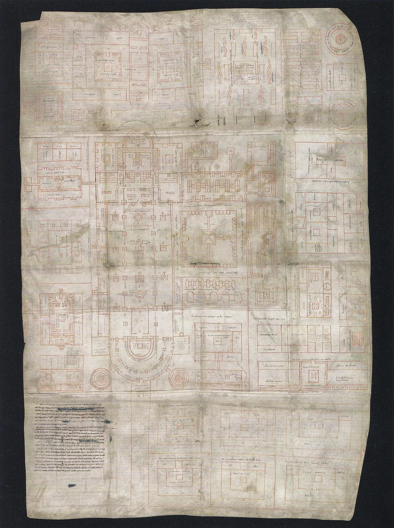 중세 수도원들은 모두가 장크트 갈렌 수도원의 기본 설계에 근접한 세부 도면에 따라 중요 시설을 배치하였습니다. 수도원 경내는 교회 남쪽만을 고집하지 않고 북쪽에도 들어섰습니다. 수도원 설계의 모범으로 자리 잡은 건물 배치는 회랑들이 둘러싼 한복판에 안뜰(atrium)이 위치하며, 둘레로는 고대 로마풍의 건물들이 들어선 형태를 취하고 있습니다.