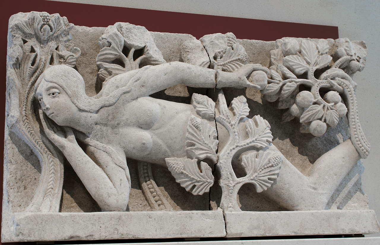 지즐레베르투스(Gislebertus)의 조각품으로 추정되는 돌판에 새겨진 장면들은 아쉽게도 일부가 소실되었습니다. 오른쪽 소실된 부분에는 악마가 자리하고 있으며 정 중앙에 묘사된 이브는 역시 소실된 부분에 해당하는 왼쪽에 있는 아담을 꾀려 무어라 속삭입니다. 이브의 손은 막 선악과를 따려고 움켜쥔 상태죠.