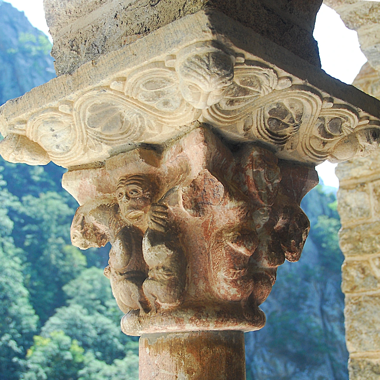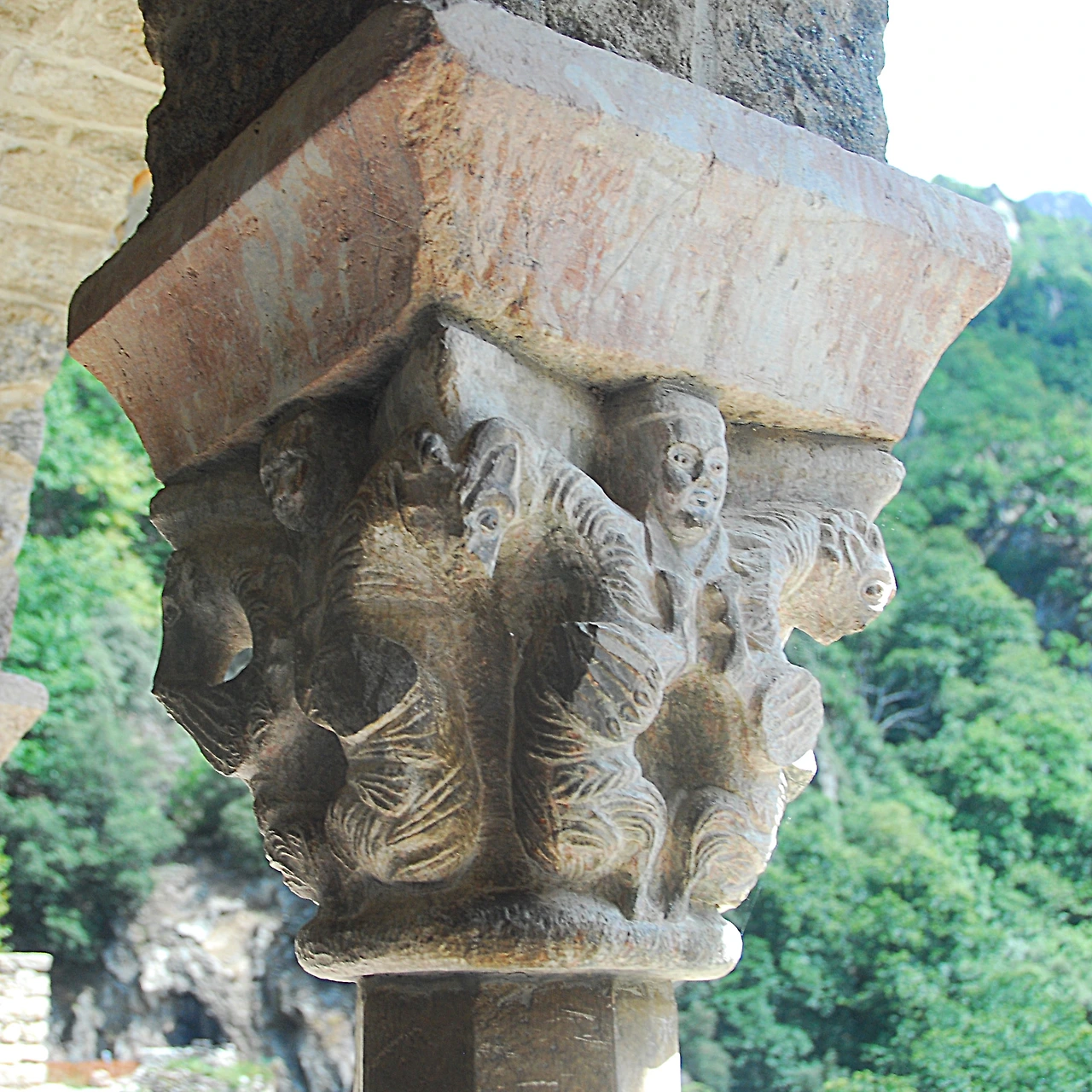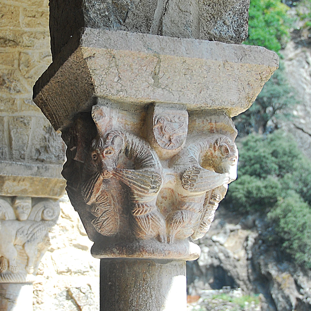 1140년경에 완성한 쿠사(Cuixà)의 성 미카엘 수도원 경내 기둥머리 장식은 빌프랑슈의 분홍빛 대리석을 작은 끌로 제작한 것입니다. 천사는 기이하게도 턱수염이 나 있고 두 짝의 날개를 달고 있습니다. 두 눈과 입술 그리고 귀를 천공기로 구멍 뚫고 파낸 것 역시 특이합니다. 동공은 천공기로 파내고 납으로 때웠습니다. 다른 조각품들과는 대조적으로 온 힘을 다해 묘사한 것 같아 특별해 보이기까지 합니다.