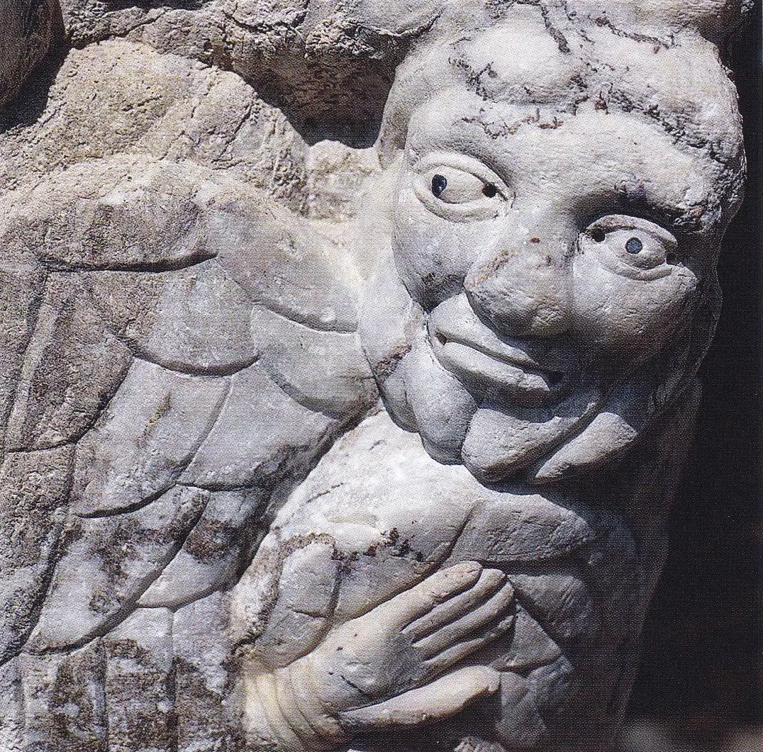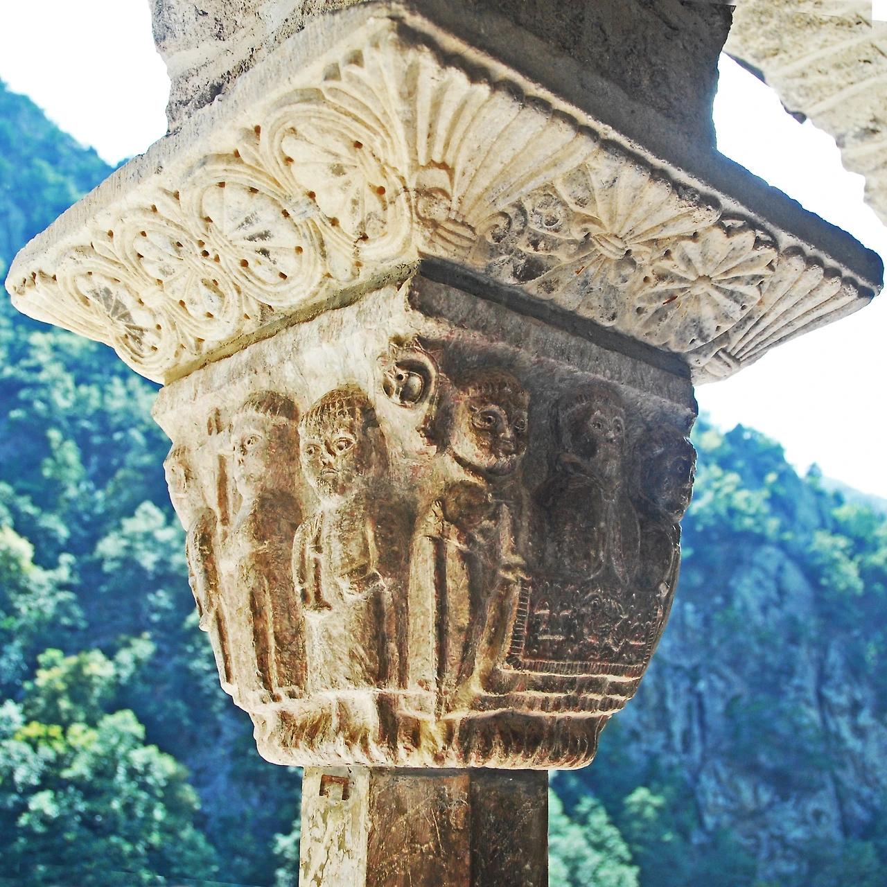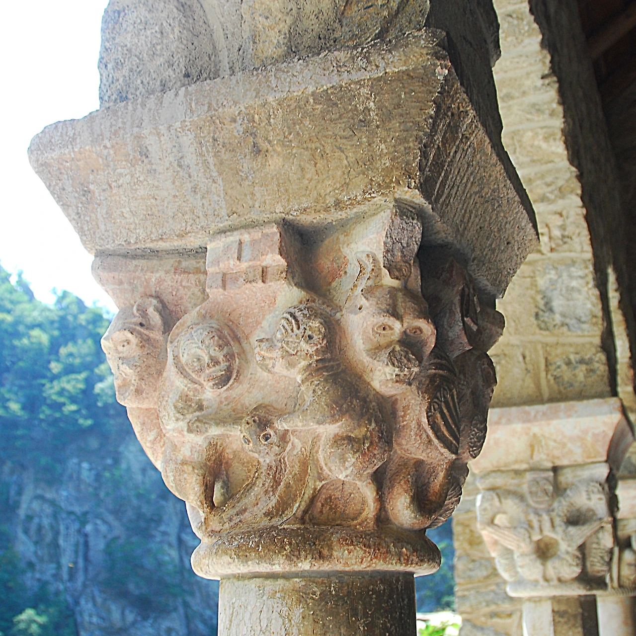 1140년경에 완성한 쿠사(Cuixà)의 성 미카엘 수도원 경내 기둥머리 장식은 빌프랑슈의 분홍빛 대리석을 작은 끌로 제작한 것입니다. 천사는 기이하게도 턱수염이 나 있고 두 짝의 날개를 달고 있습니다. 두 눈과 입술 그리고 귀를 천공기로 구멍 뚫고 파낸 것 역시 특이합니다. 동공은 천공기로 파내고 납으로 때웠습니다. 다른 조각품들과는 대조적으로 온 힘을 다해 묘사한 것 같아 특별해 보이기까지 합니다.