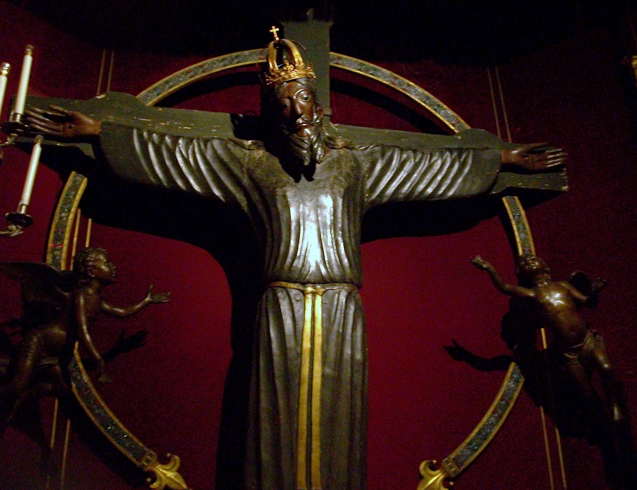 로마네스크 조각가들은 한결 같이 십자가의 고통으로 일그러진 예수의 인간적인 모습을 형상화한 것이 아니라 오히려 이를 순순히 받아들이는 예수 그리스도의 영광스러운 모습을 담고자 노력했습니다. 루까 대성당의 십자고상인 ‘성스러운 얼굴(Volto Santo)’은 매우 잘 알려진 십자고상으로 이를 숭배하는 순례자들이 이를 직접 보기 위하여 전 유럽에서 몰려들 정도였죠.