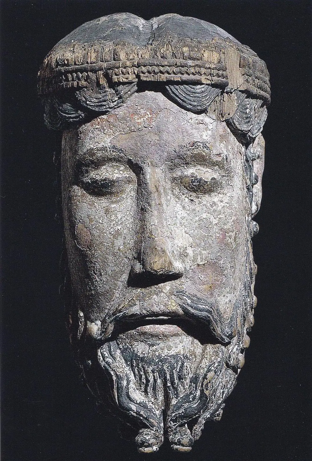 [1] 미루나무로 제작한 것으로 아직까지 남아있는 색칠로 인해 원래 다색으로 장식칠을 한 것이었음을 짐작할 수 있습니다. 이 두상 조각은 라보디유(Lavaudieu)의 성안드레아 성당에서 사용하던 십자가에 붙어있던 것입니다.