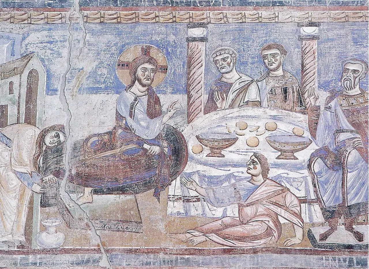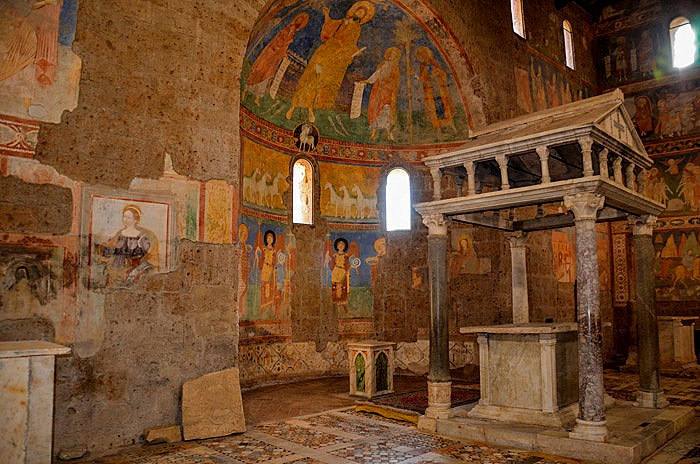 왜냐면 벽화에서는 이탈리아 로마네스크만의 감수성이 물씬 풍기는 회화적 구성과 생동감마저 느껴지기 때문입니다. 보존이 아주 잘된 경우라서 회화적 장면 전개는 교회 안쪽 저 깊숙이까지 상당히 특별하다 생각되는 장면들을 정확하게 보여주고 있습니다. 각 장면들은 전통적인 기법으로 분할된 틀 속에 펼쳐져 있습니다.