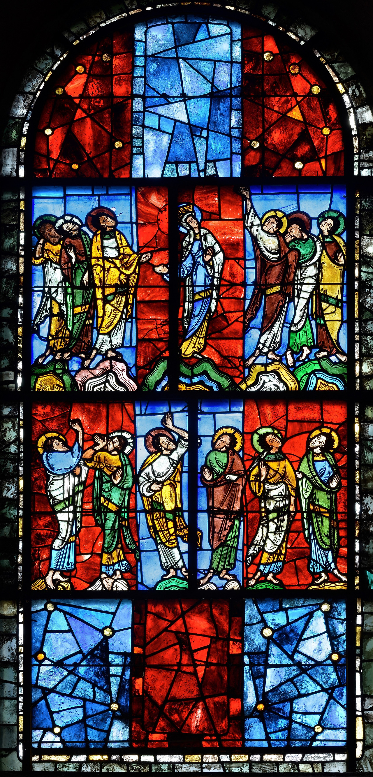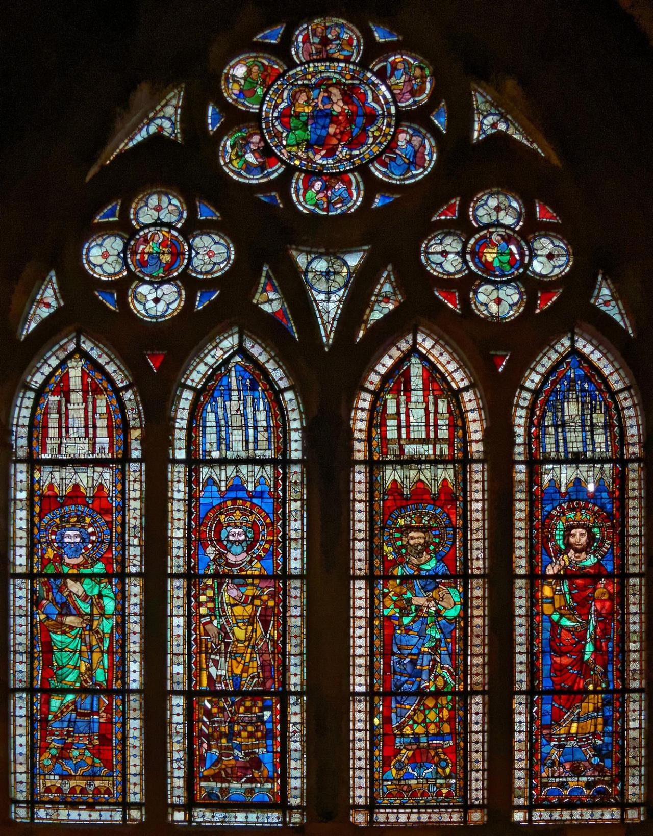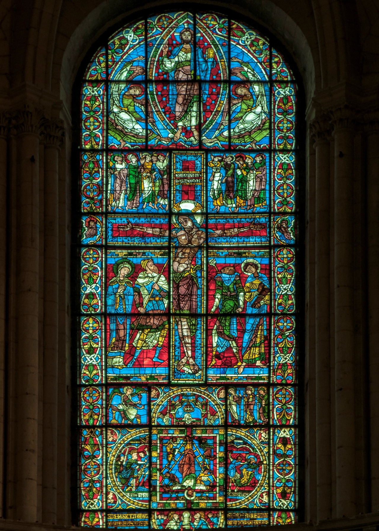 색을 입힌 유리 조각들을 납으로 된 그물처럼 얼키설키 만든 꽂을대에 정교하게 끼워 넣었습니다. 유리창에는 성서에 등장하는 장면들이 각각 그려져 있죠. 얼굴과 옷 주름을 묘사하기 위해 사용한 윤곽선들은 유리에 그림을 그려 넣게 되면서 발전을 거듭한 이른바 그리자이유(grisaille) 기법에 따른 것입니다.