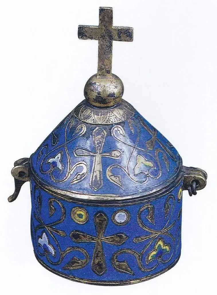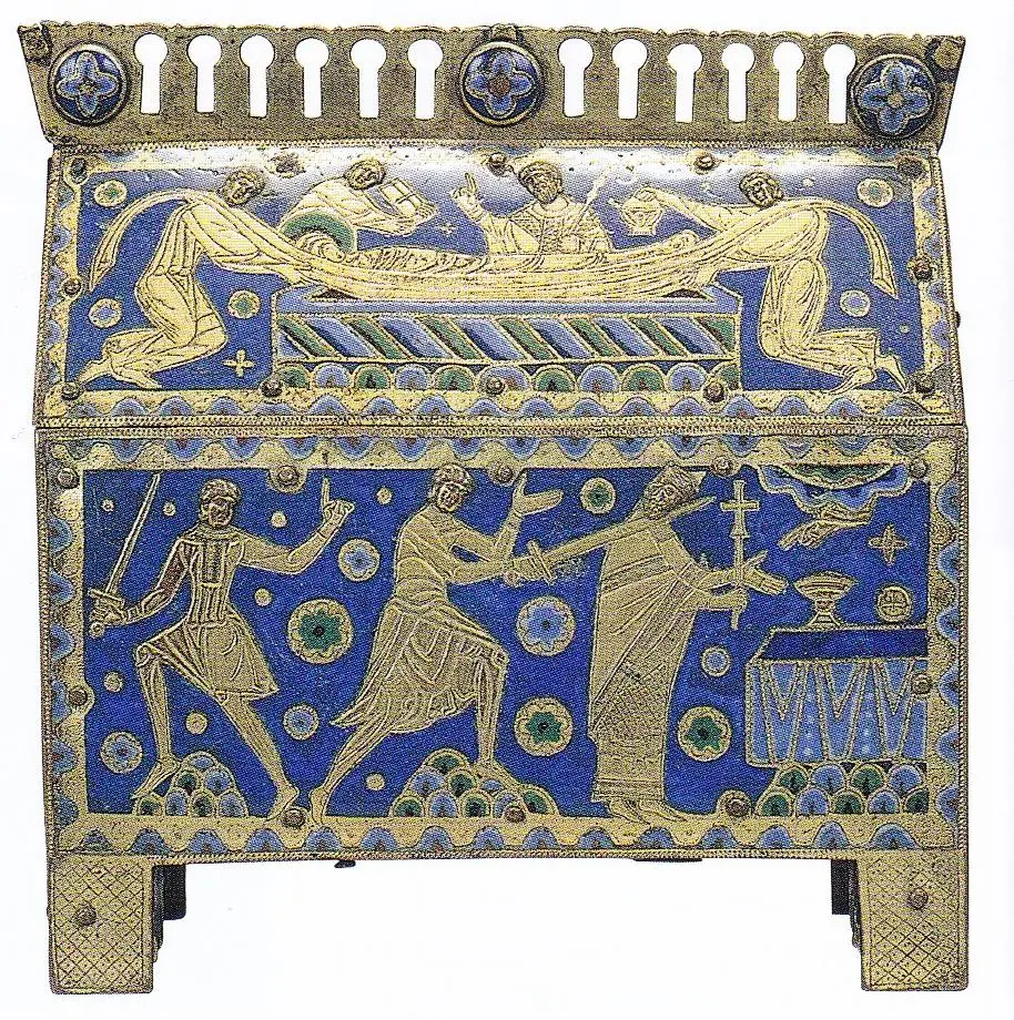 성물함은 12세기에 리모쥬(Limoges)에서 생산된 금박을 입힌 구리 판의 표면을 긁어내고 법랑을 부어 굳힌 세공품입니다. 파리 루브르 박물관에 소장되어 있습니다.