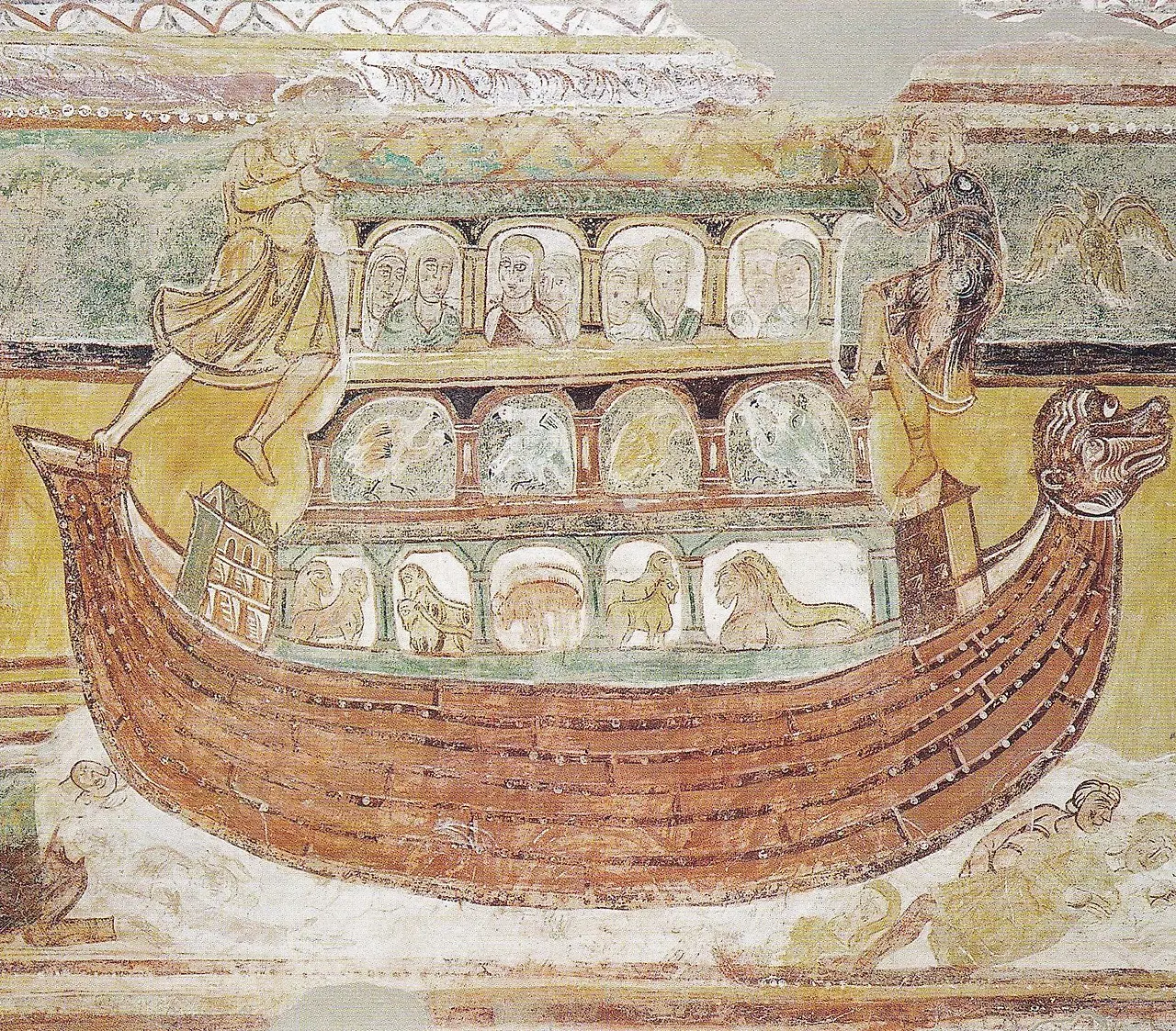 대홍수로 말미암아 물 위에 떠있는 네모 반듯한 배 안에는 송장들로 가득합니다. 바이킹의 드라카르(drakkar)를 연상케 하는 뱃머리는 개의 형상을 한 용머리를 하고 있고 눈빛은 비둘기를 잡아먹고 싶어 침을 흘리는 듯하죠. 용머리 위를 날고 있는 비둘기는 대홍수가 끝났음을 암시해줍니다.