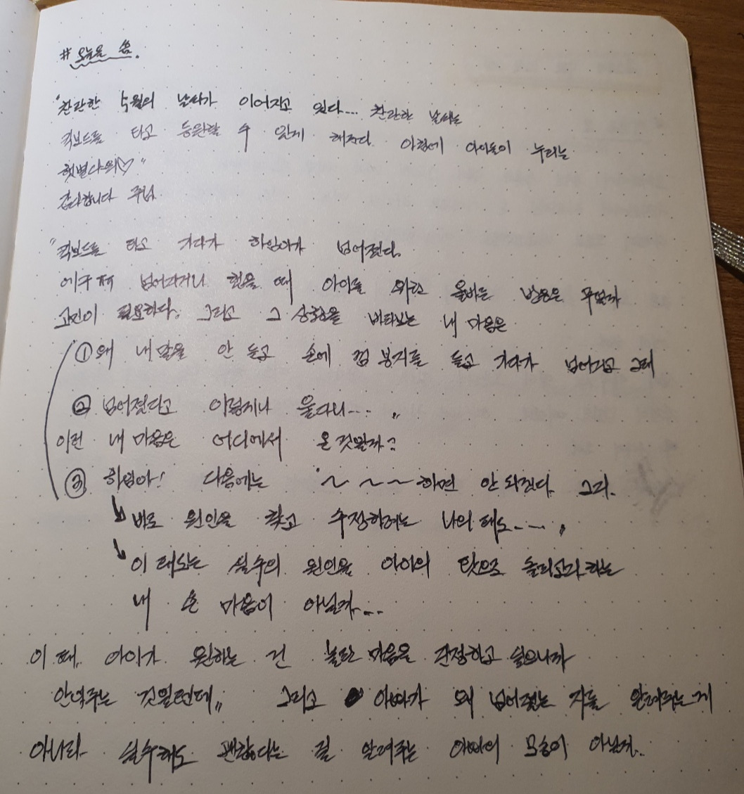 나는 울음이 멈추기를 기다리면서 우는 아이의 등을 적당히 습관처럼 토닥여주었다. 사실 내 말을 듣지 않은 것 때문에 아이에게 삐졌던 걸까? 자꾸만 마음이 안 좋게만 흘러갔다. 그래도 다행히 입을 꾹 다물고 있으니 아직까지는 아이를 향한 반응이 그리 나쁘지만은 않다고 생각했다. 그리고는 최대한 부드럽고 친절한 것 같은 나름의 어투로 아직 우는 아이에게 말했다.