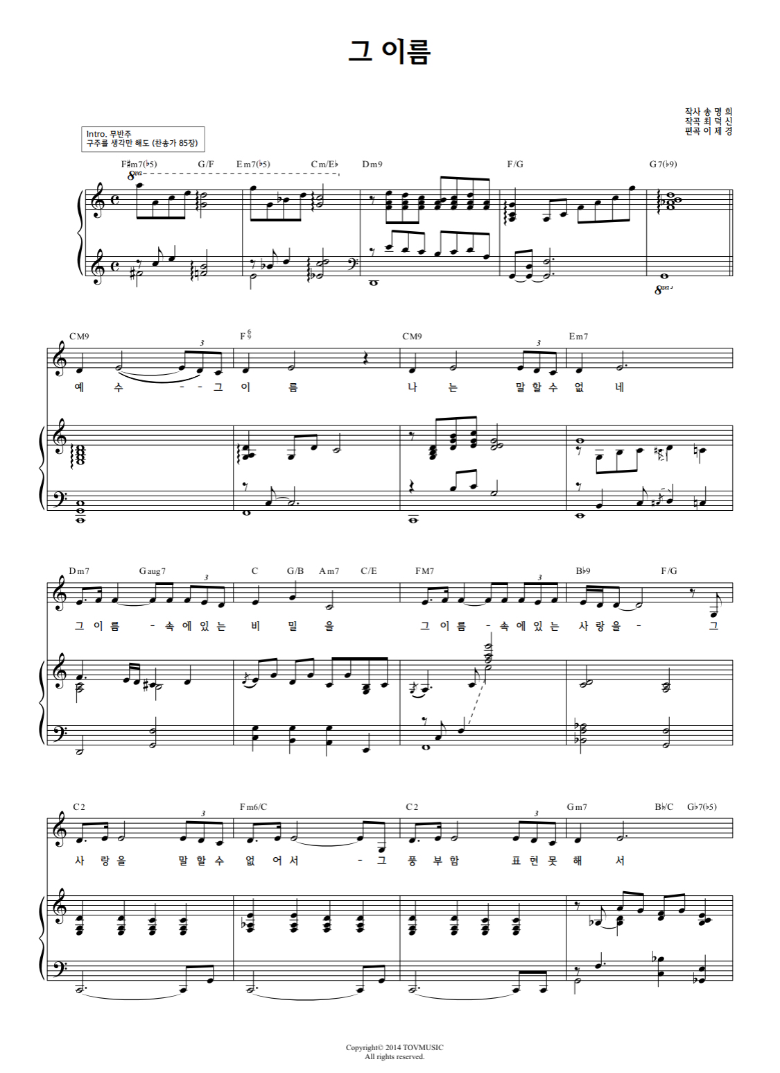오랜 기간 좋아했던 곡이라서 연주곡이든 합창이든 편곡해두면 좋겠다 싶었는데, 마침 아내가 작은 무대에 서게 되어 이 곡을 하기로 했고 맞추어 편곡을 한 게 벌써 3년 전이다. 곡 제목에 맞게 예수 그 이름의 의미를 다시 생각해보며 그 이름이 잘 들려지고 전해지면 좋겠다는 마음으로 작업을 시작했다. 피아노만 사용할 수 있는 무대라서 목소리에 집중할 수 있도록 전체적인 분위기는 클래시컬한 쪽으로 하되 코드와 형식에 조금 변화를 주었고 Intro/Outro는 아내가 좋아하는 찬송가로, Interlude는 곡 분위기에 맞춰 클래시컬하게 피아노 솔로를 채웠다. 원곡이 잔잔하고 그 느낌을 살리는 것도 괜찮다고 생각했지만 노래하는 입장에서 잠깐의 클라이맥스가 나와도 좋을 것 같아서 단 3도 키업으로 살짝 분위기만 바꿨다가 다시 돌려놓았다.