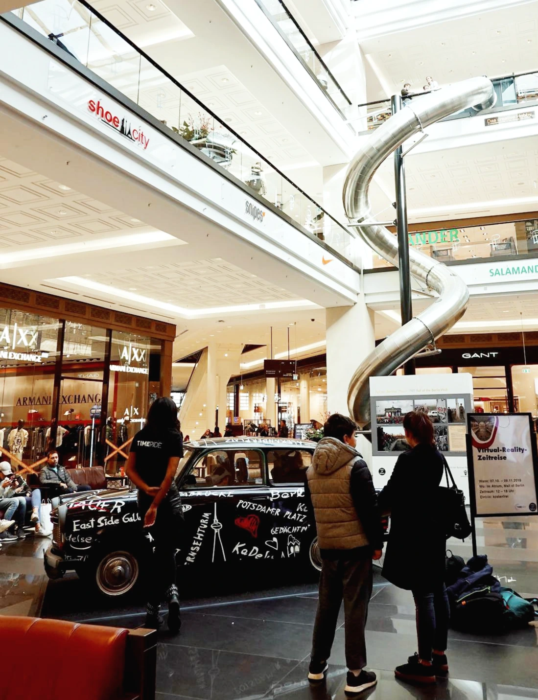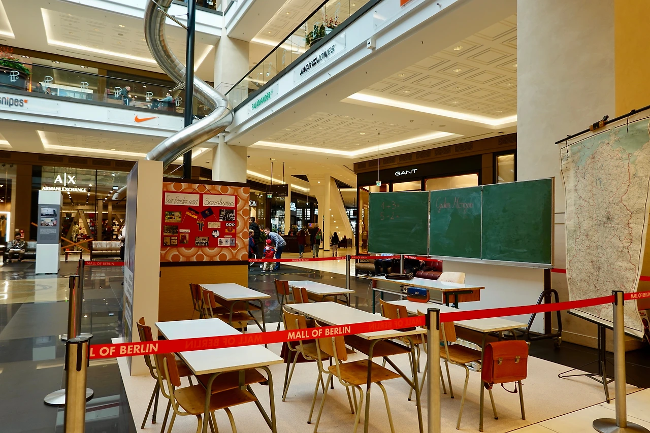 mall을 둘러보며 놀라왔던 점은 많은 공간들을 역사의식을 심어주기 위한 공간으로 활용한다는 것이었다. 비싼 땅에 매장을 하나라도 더 받아야 남는 장사일 텐데.. 경제논리만으로 따지자면 도저히 납득하기 힘든 일이었다. 물론 최근엔 국내에서도 몇몇 백화점들이 문화적 공간을 만들어 소비자의 유인책으로 쓰는 마케팅의 방식을 도입하곤 있지만 몰 한가운데에 오래된 자동차를 두고 탑승하면 VR을 이용하여 체크포인트 찰리를 통과할 때의 모습을 보여준다던가 당시의 교실의 모습을 재현해 둔다던가 하는 식으로 역사공부를 할 수 있는 공간으로 활용한다는 것은 마케팅을 위한 장치로만 보이진 않았다.