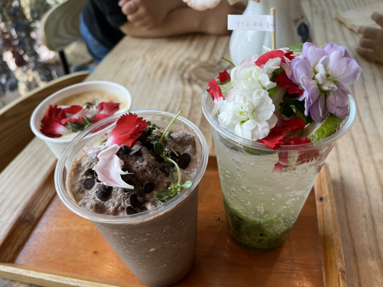 음료 위에는 식용꽃들이 그 자태를 뽐내고 있다.
