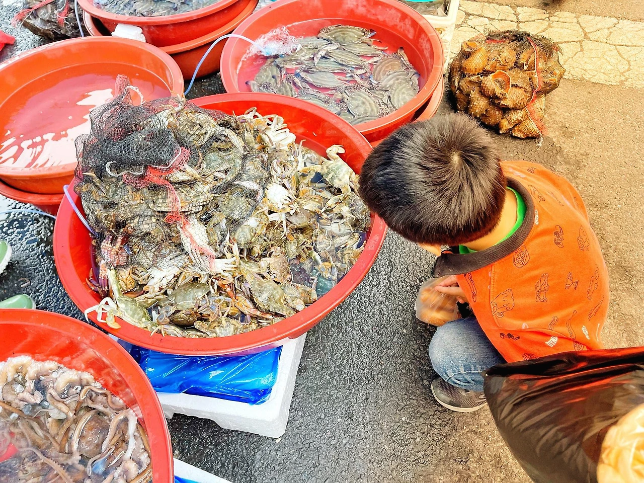 둥이들은 살아있는 꽃게를 구경하는 것만으로도 재미있나 봐요.