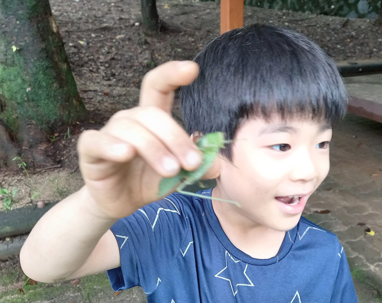 자세히 보니 메뚜기와는 또 다른 생김새, 여치이다. 그동안 메뚜기, 귀뚜라미는 많이 잡아 보았지만 여치는 처음 본다. 여치는 통통하며, 앞다리가 긴 게 특징이었다.