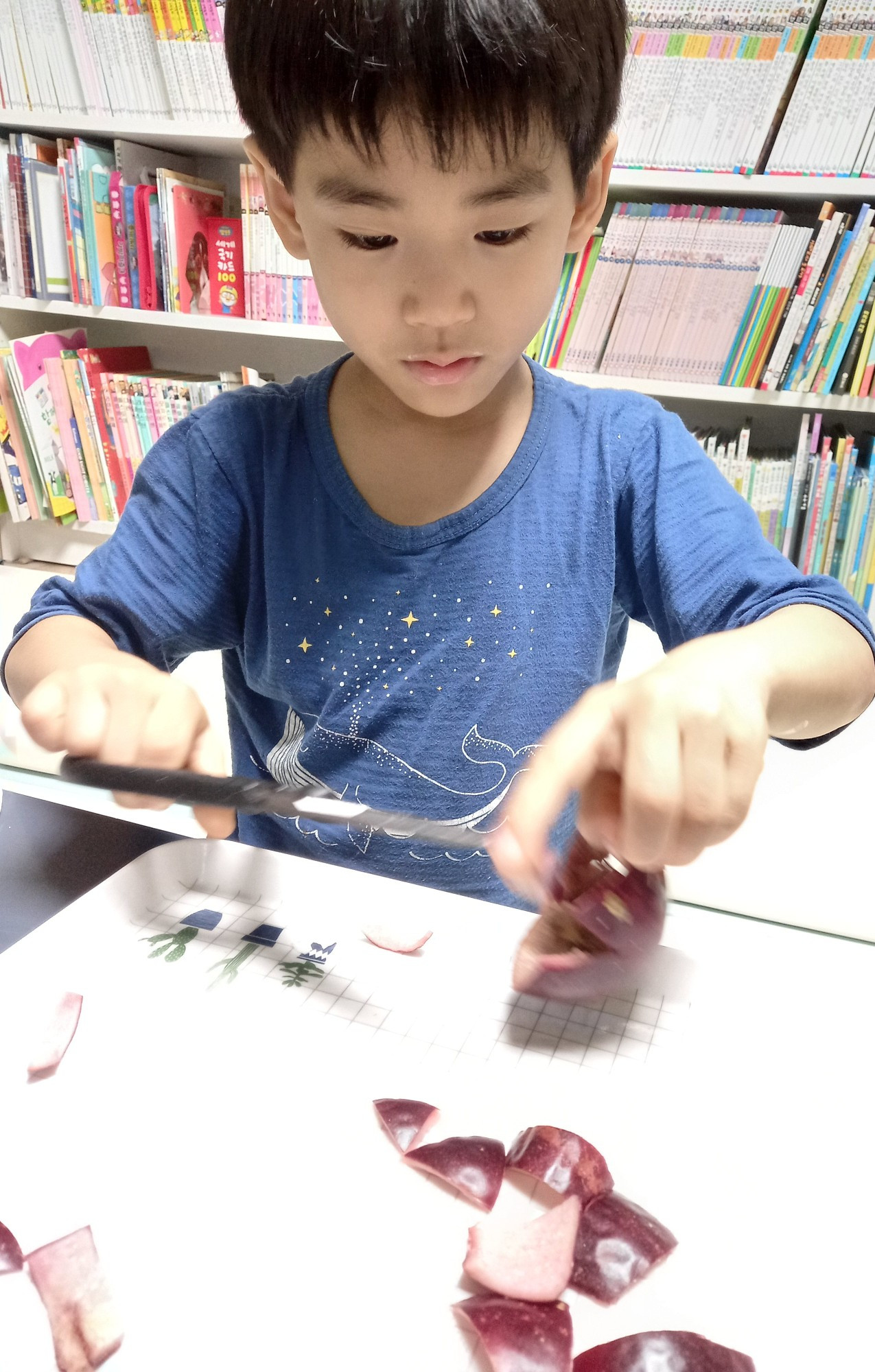 깨끗하게 씻은 껍질을 아이들이 직접 가위로 싹둑싹둑 자른다.