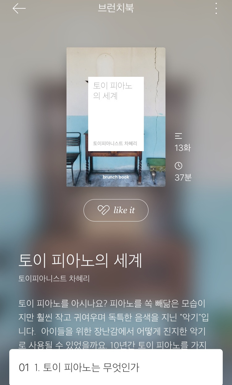 어제 새벽에 토이 피아노에 대한 정보를 다룬 [토이 피아노의 세계] 칼럼을 브런치북으로 묶었습니다. 그리고 난생 처음으로 제가 쓴 글로 공모전에 지원을 해보았어요.