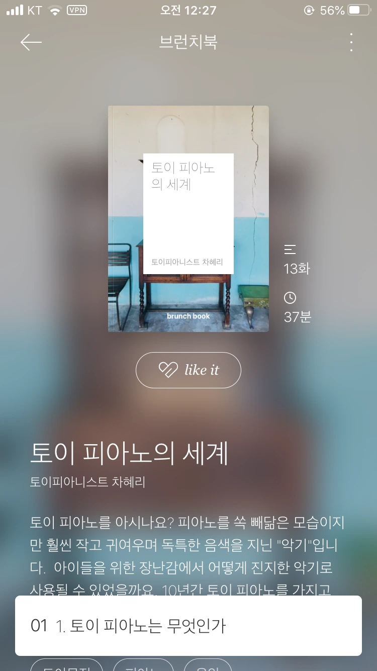 이러한 작업들과 함께 브런치 플랫폼에서 토이 피아노에 관한 글을 쓰기 시작했습니다. 제가 알고 있고, 알리고 싶은 토이 피아노 정보를 문서화해서 정리하고 싶었거든요. 아니 좀더 솔직히 말하자면 내가 이렇게 좋아하는 토이 피아노를 다른 사람들도 알게 되어 좋아해줬으면 하는 마음으로 쓰게 되었습니다.