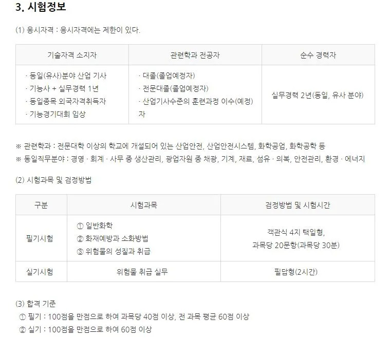 저는 그중에서도 위험물산업기사를 제일 먼저 땄습니다. 쌍둥이 동생이 화학공업고등학교를 졸업하고 얻은 위험물기능사 자격증이 있어서 그나마 익숙했거든요, 학교도 바로 옆이라 저는 00 고등학교, 동생은 00 화학공고를 나왔습니다. 막상 위험물 자격증 시험을 보려고 하자 어떤 걸 고를지 망설여졌습니다. 사람들에게 묻고 인터넷을 뒤져보니 위험물기능사 시험은 산업기사보다 쉽다는 평이 많았습니다. 또 화학식도 거의 외울 필요가 없다고 하더라고요, 그런데 쉬운 자격증은 왠지 시험을 치르고 싶지 않았습니다. 그렇다고 해서 곧바로 위험물기능장 시험을 볼 수는 없었습니다. 응시자격이 되지 않아 위험물기능사와 산업기사 중 하나를 골라야 했습니다. 문과 출신인 제가 시험을 치를 수 있는 자격요건으로는 소방관으로 재직한 지 5년이라는 증명서 하나뿐이었습니다. 순수경력자(실무경력 2년 이상)에 해당되어 두 시험 모두 치를 수 있었습니다. 꼴에 자존심이 있지, 난이도 있는 시험을 보고 싶어 고른 것이 위험물산업기사입니다. 자신 있게 시험을 골랐던 처음과는 달리 자격증을 얻는 데는 2년이나 걸렸네요. 필기와 실기 모두 한 번에 붙었지만 필기 붙고 다시 실기 시험을 치르기까지 근 1년을 도망 다녔습니다(화학식 80여 개 정도를 외워야 하는데 너무나 외우기 싫어 바로 내뺐습니다).