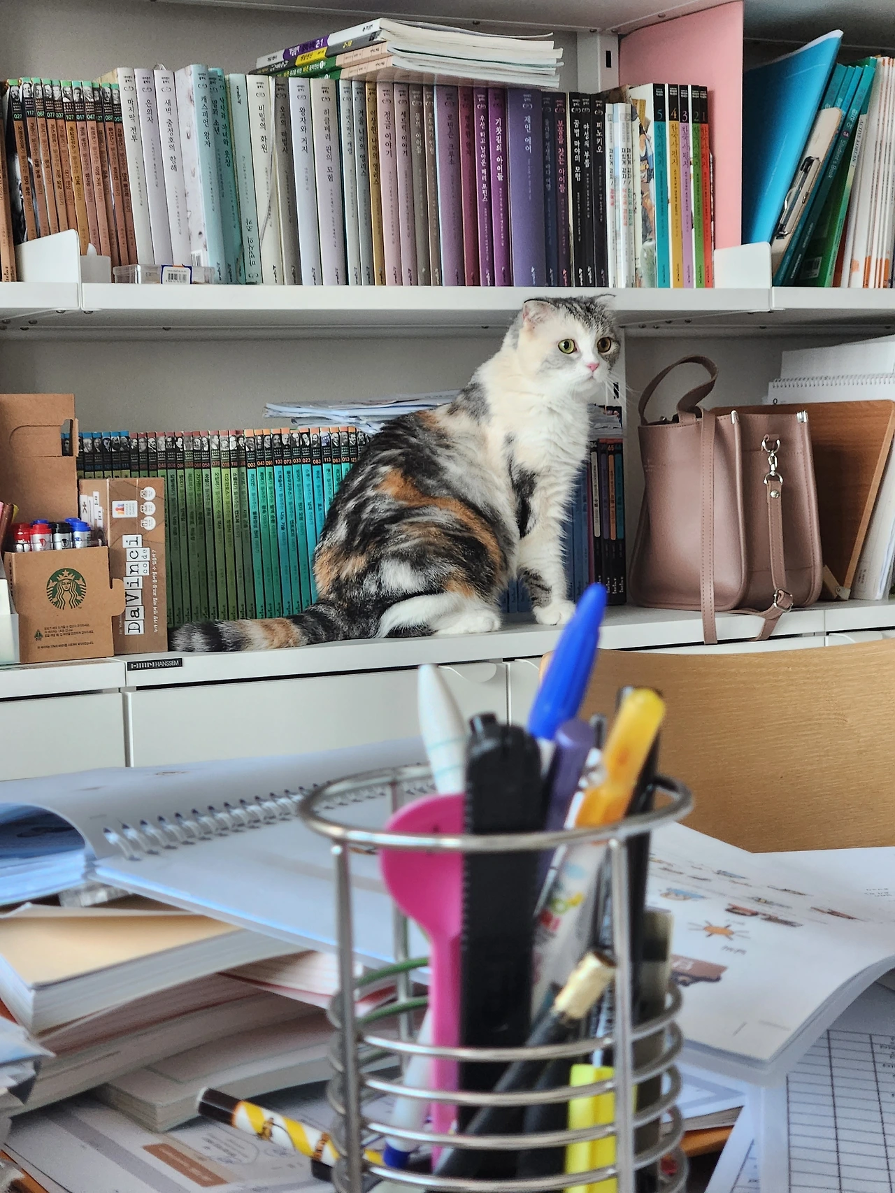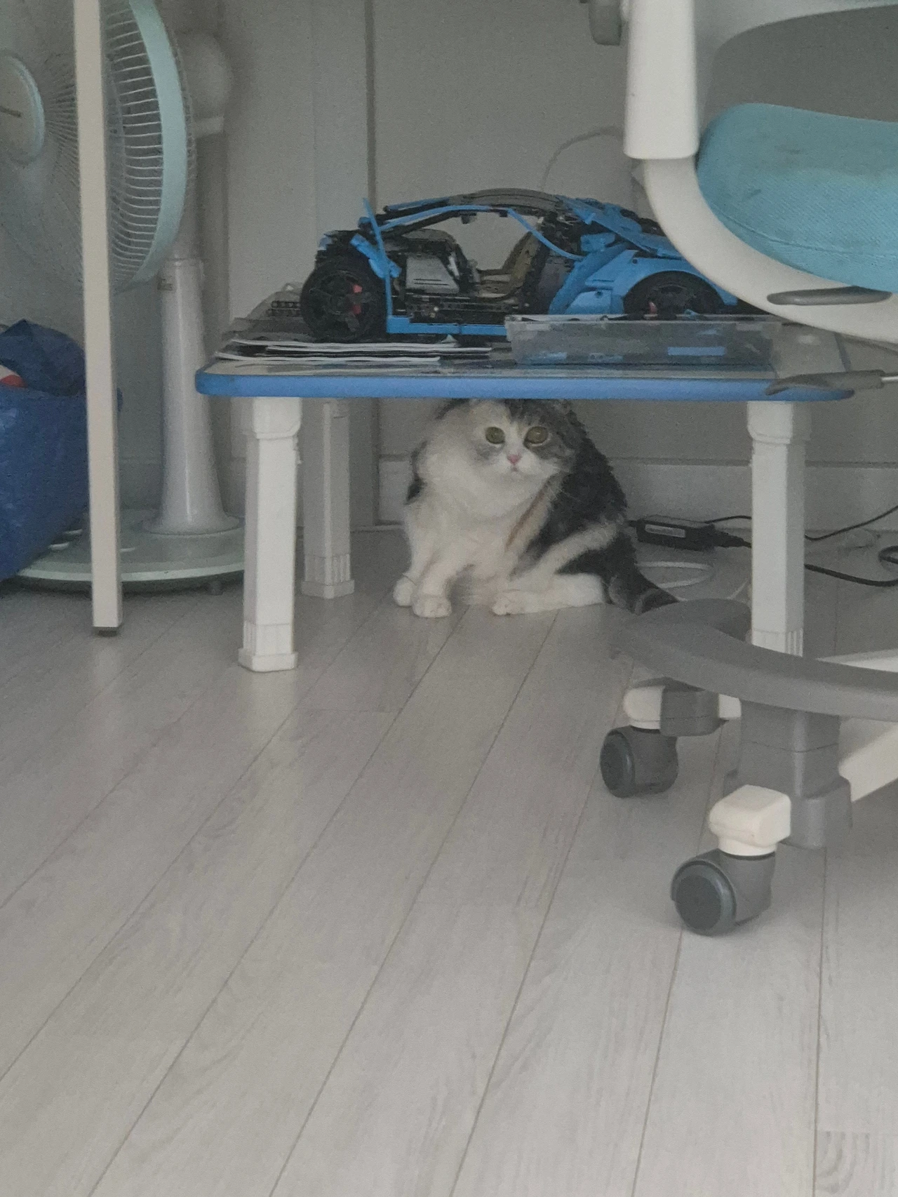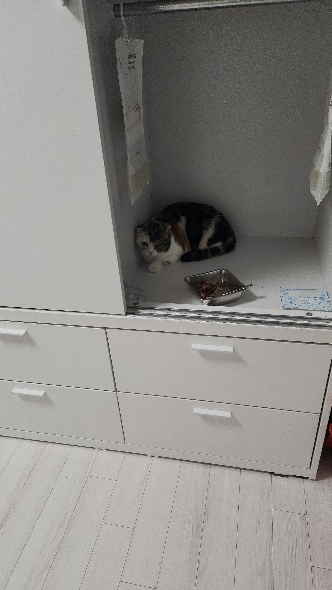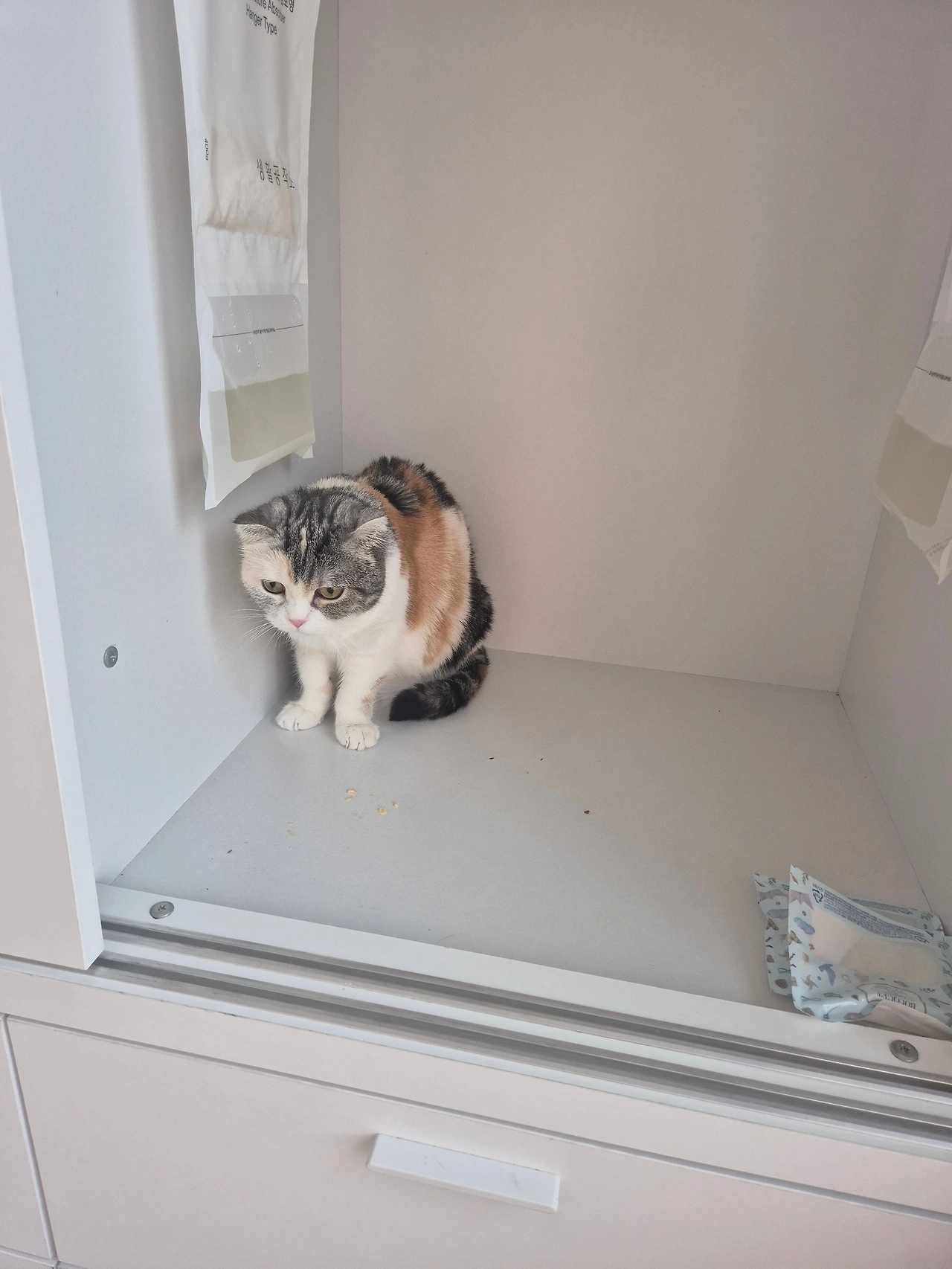 그렇게 마리(처남이 키우는 스코티시폴드, 암컷 4살)의 임시보호가 결정됐습니다. 처남이 내일 직접 와서 마리와 사료, 여러 용품들을 놓고 고양이 키우는데 필요한 것을 설명해 준다고 얘기가 마무리됐습니다. 하지만 저는 근무라서 하루가 지난 금요일 오전이 되어서야 마리를 만날 수 있었습니다. 저희 가족들은 그동안 1년에 1~2번 정도 마리를 만나왔습니다. 처남 집에 갈 때면 우리를 낯설어한 마리가 도망을 치긴 했어도 곁을 내줘 쓰다듬거나 먼저 다가와서 우리 냄새를 맡는 등의 행동을 보여 마리에게 낯선 존재는 아니겠지라고 마음을 놓았습니다. 그래서 마리와 지낼 4일 동안 고양이를 좋아하는 저와 아이들의 사심을 듬뿍 채울 생각이었습니다.