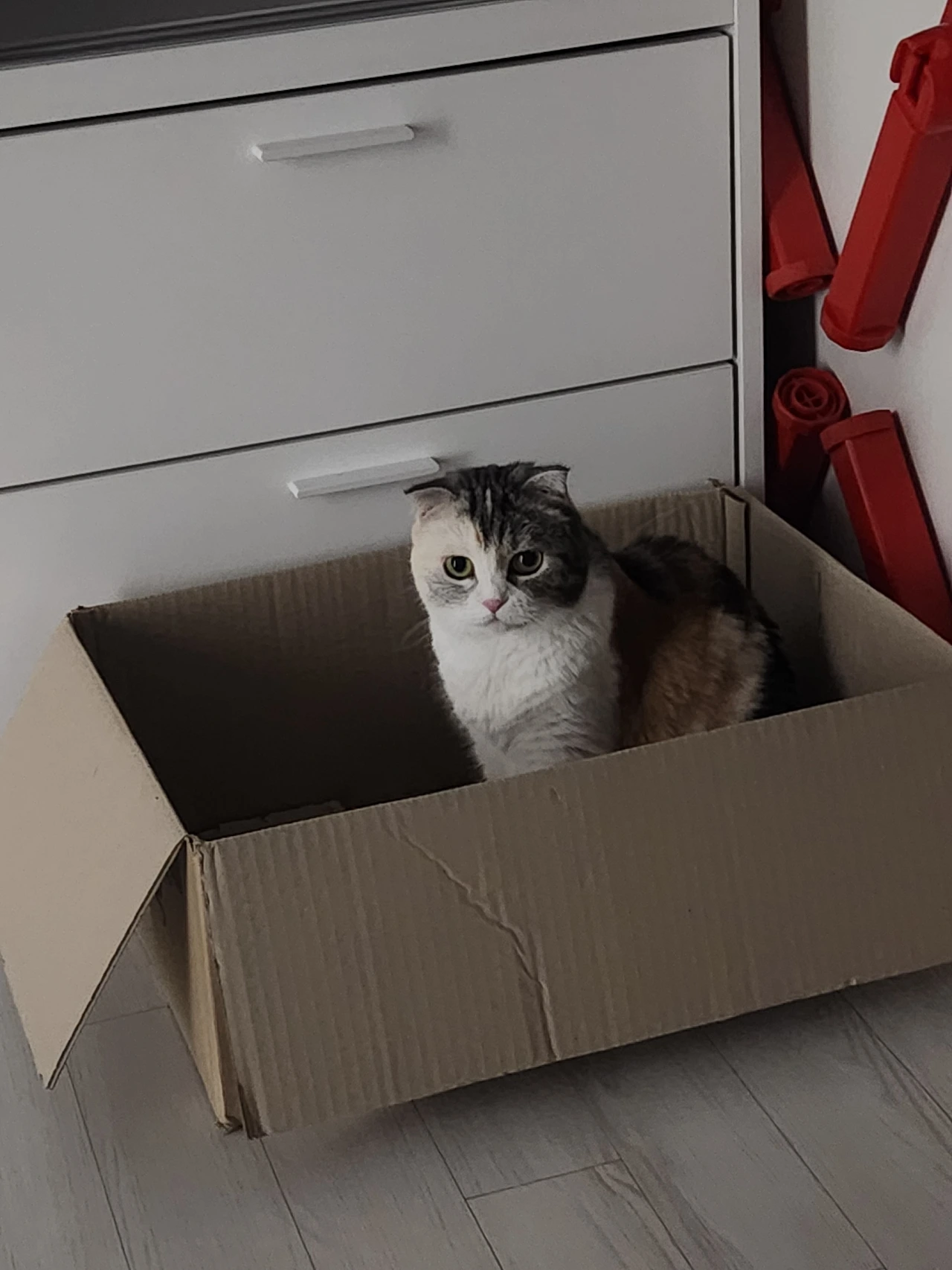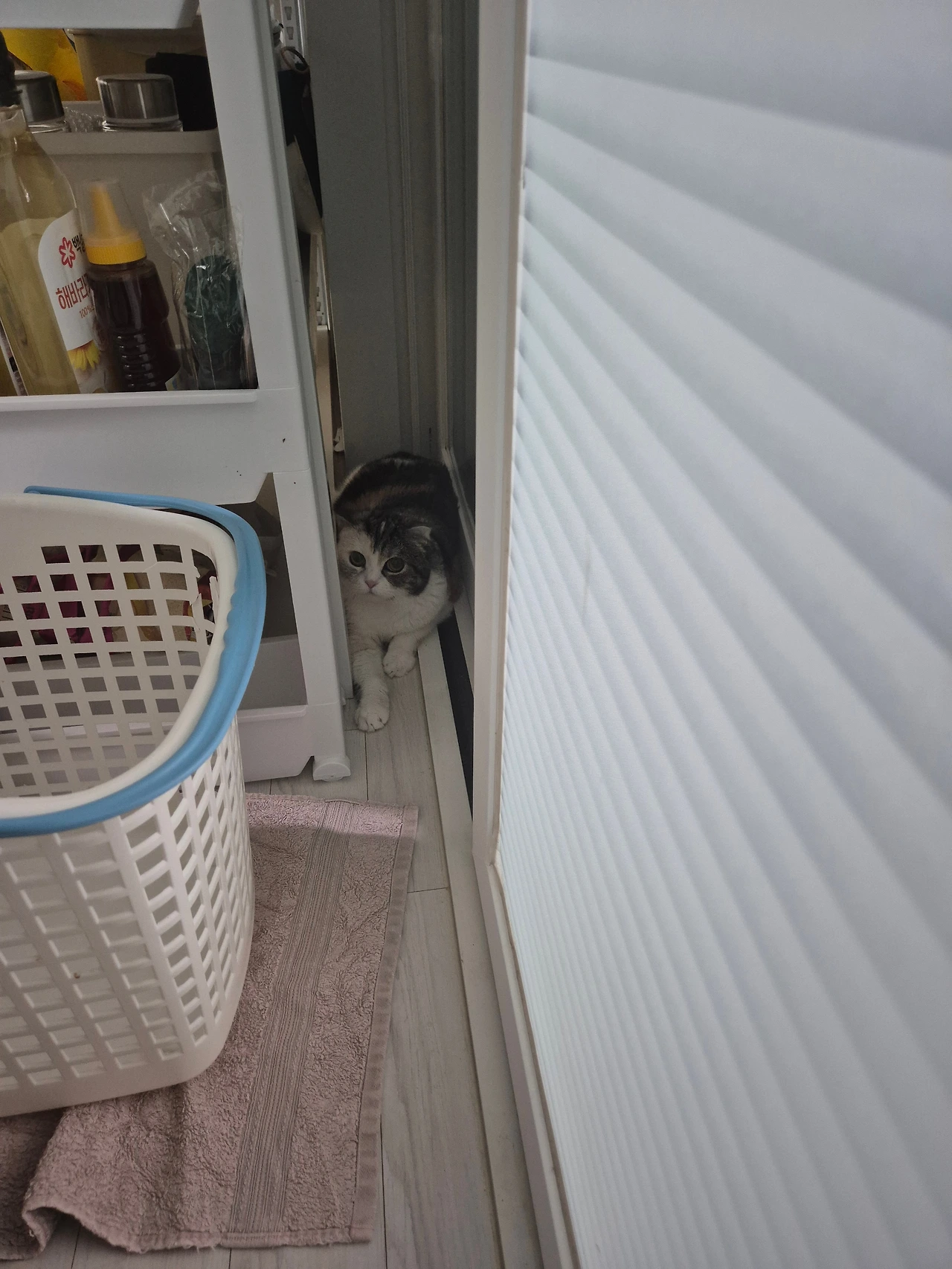 1. 작은 아이가 가져다준 박스에 들어간 마리 2. 선반 뒤에서 째려보는 마리