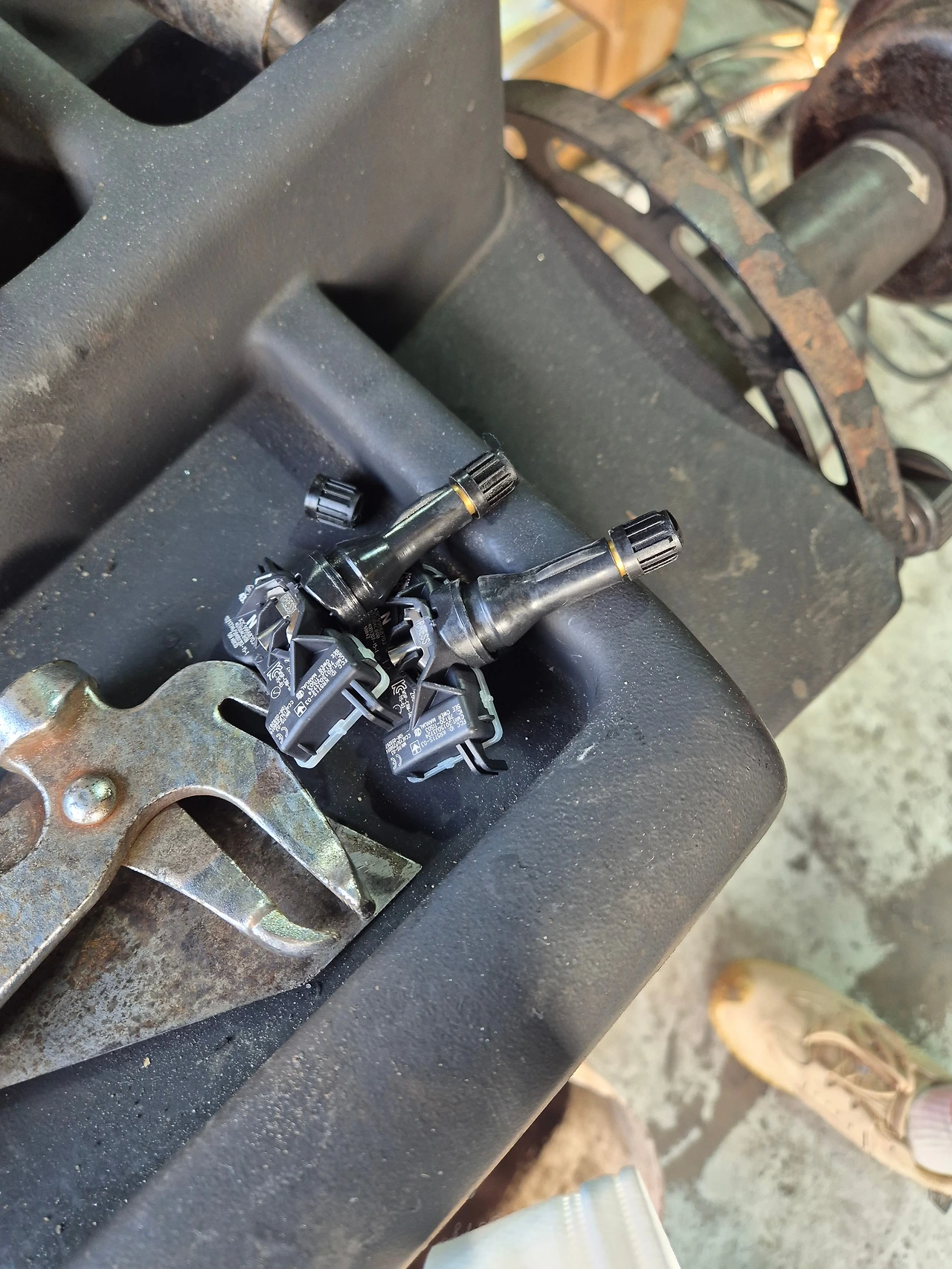 직접 작업장에 가서 작업 기사의 말을 들어 보니 조수석 타이어는 센서 배터리 부위가 사라진 채 공기 주입 밸브만 있었고 다른 타이어 3곳은 공기주입 밸브와 센서 부분이 분리된 채 굴러 다니고 있다는 내용이었습니다. 제대로 장착되지 않아 그동안 계기판에 에러 메시지가 떴을까요라는 제 질문에 작업기사는 아마도 그럴 확률이 높다고 답했습니다. 그동안 제 궁금증이 확실하게 해결되는 순간이었습니다. 제가 카페에서 찾아본 글에서는 글쓴이와 주변 사람들에게 여러 번 시험했어도 자기가 산 알리발 TPMS는 잘 인식이 됐다고 했는데 같은 판매처에서 산 제 TPMS는 2주 동안이나 왜 인식되지 않을까 의아하게 여겼는데 장착 문제로 인식되지 않을 줄이야... 참 허탈했습니다. 2주나 지났으니 그냥 넘어갈까 생각했습니다. 대신 혹시 모르니 증거사진은 여러 장 찍었습니다. 타이어와 TPMS 센서를 장착하고 집으로 오는 길에 생각하니 이건 그냥 넘길 일이 아니라는 생각이 들었습니다. 제 성향이 남들과 잘 싸우지 않지만 이 문제만큼은 제대로 따져서 장착비를 환불받아야겠다고 생각해 예전 TPMS 장착점으로 차를 돌렸습니다.