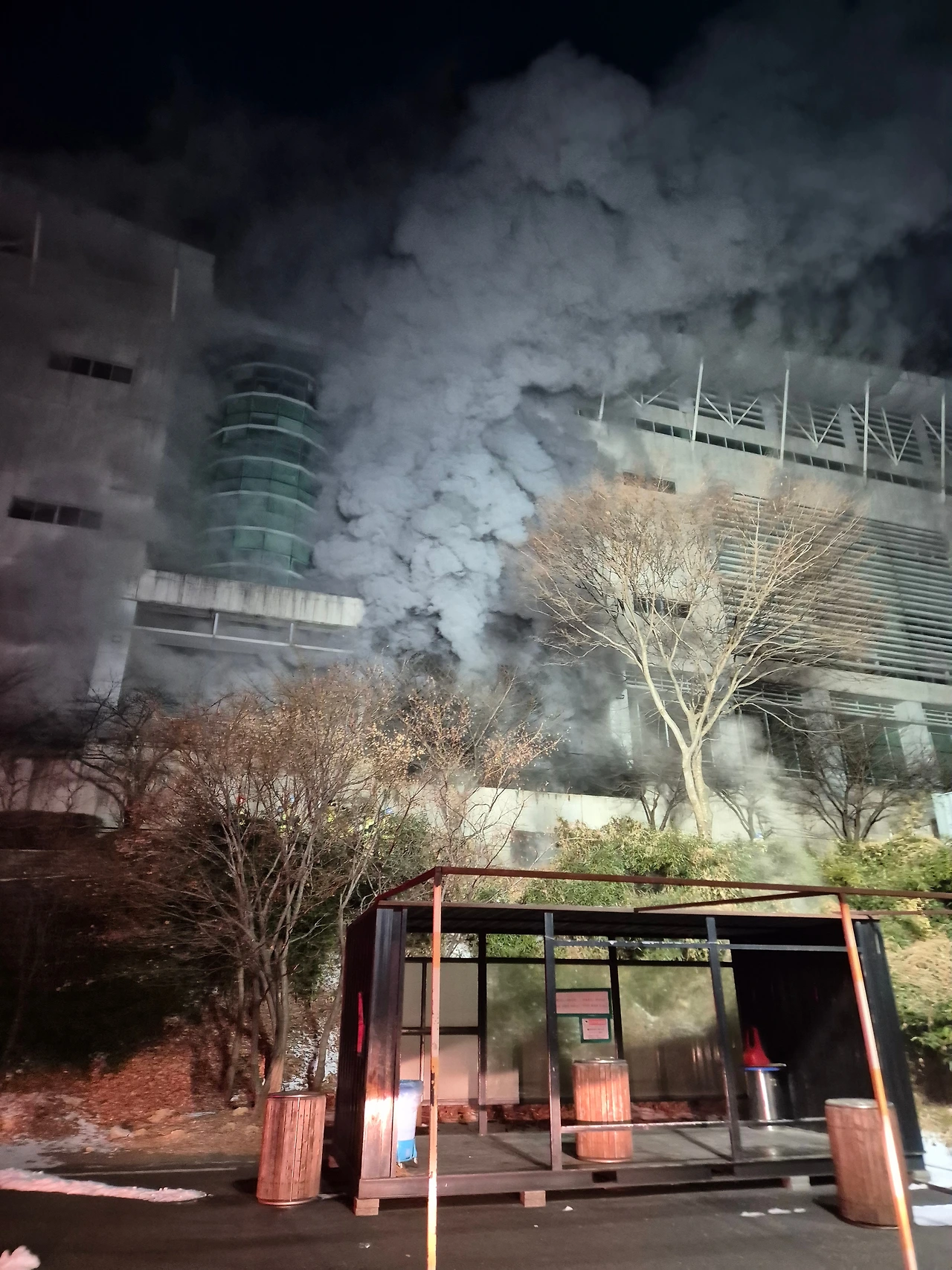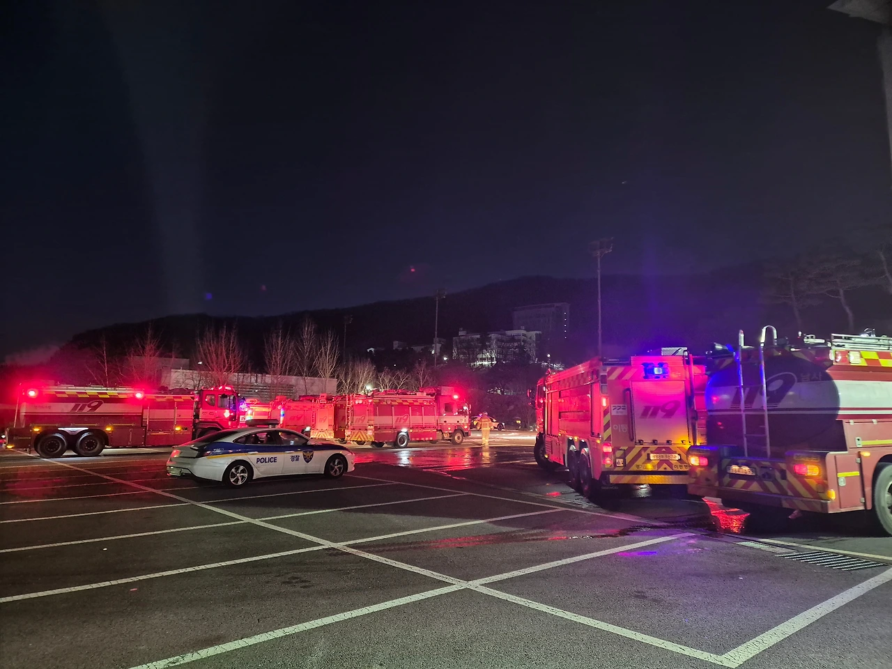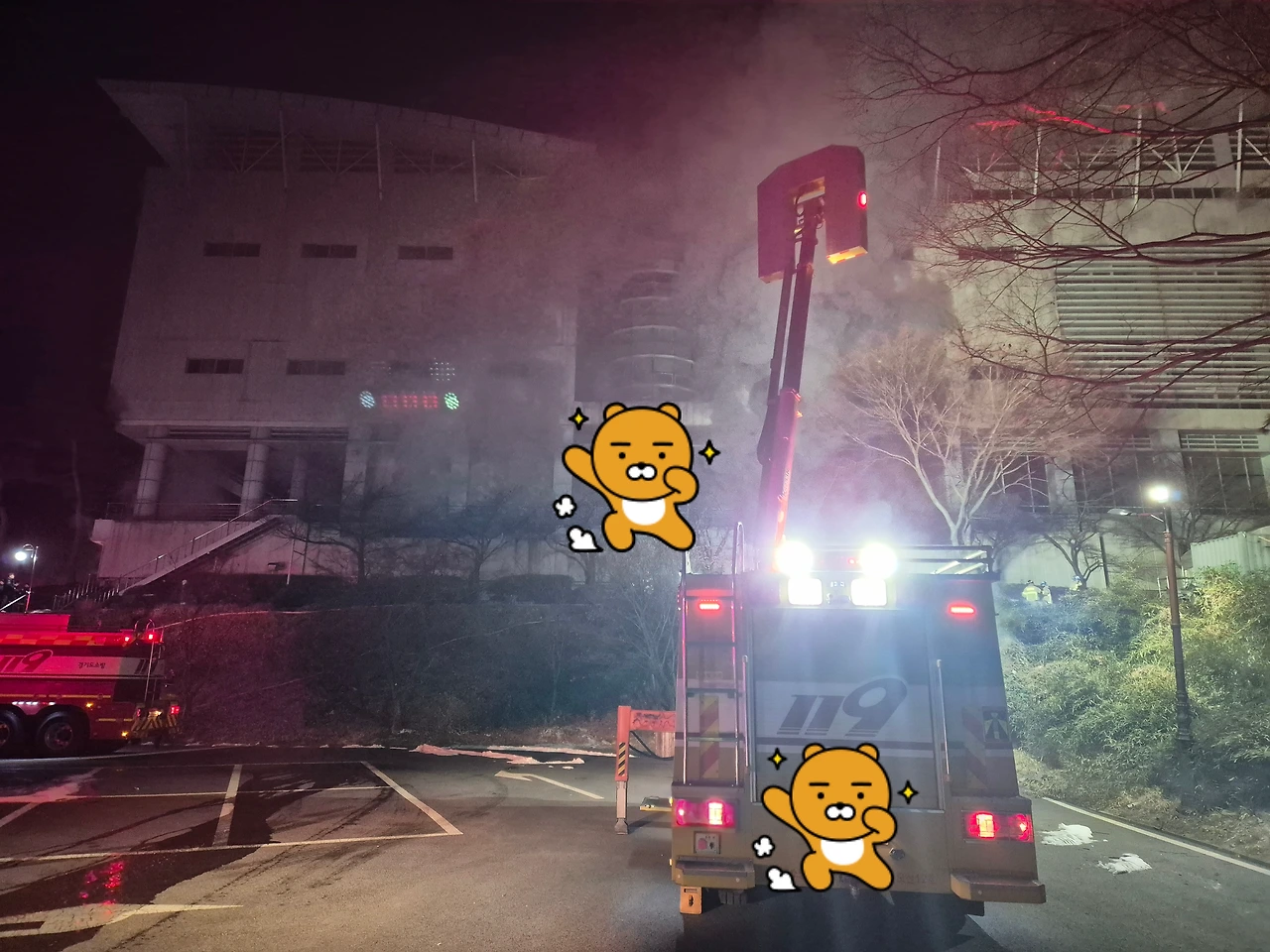 다음 근무날이었습니다. 전 근무 날 출동했으니 별일 없겠지라고 안심했습니다. 그러나 그건 나만의 착각이었습니다. 새벽 5시 40분쯤 또 조연차량 출동 방송이 들렸습니다. 이번에는 00 대학교 지하에서 불이 났다고 합니다. 오잉? 학교에서 웬 불? 30km 정도의 거리를 운전해 화재현장에 도착했습니다. 대학교 한 건물의 지하에서 새카만 연기가 나오고 있었습니다. 출동했으니 일을 해야지요. 해가 뜰 때까지 연기가 뭉게뭉게 피어 나오는 곳을 향해 조연차의 조명을 환하게 비췄습니다. 날이 밝은 뒤에는 화재 현장에서 대기하다 근무시간이 지나 다음 근무팀이 화재현장까지 와서 교대하는 현장교대를 했습니다. 교대를 마치고 소방서로 복귀하니 10시 반이 다 된 시각이었습니다. 그렇게 두 번 연속으로 이어진 조연차 화재출동은 끝이 났습니다. 그 뒤 여러 화재 출동이 있었지만 다행히 제 근무날은 아니었습니다. 글로만 읽으니 심심하시죠? 사진 몇 장 올려봅니다.