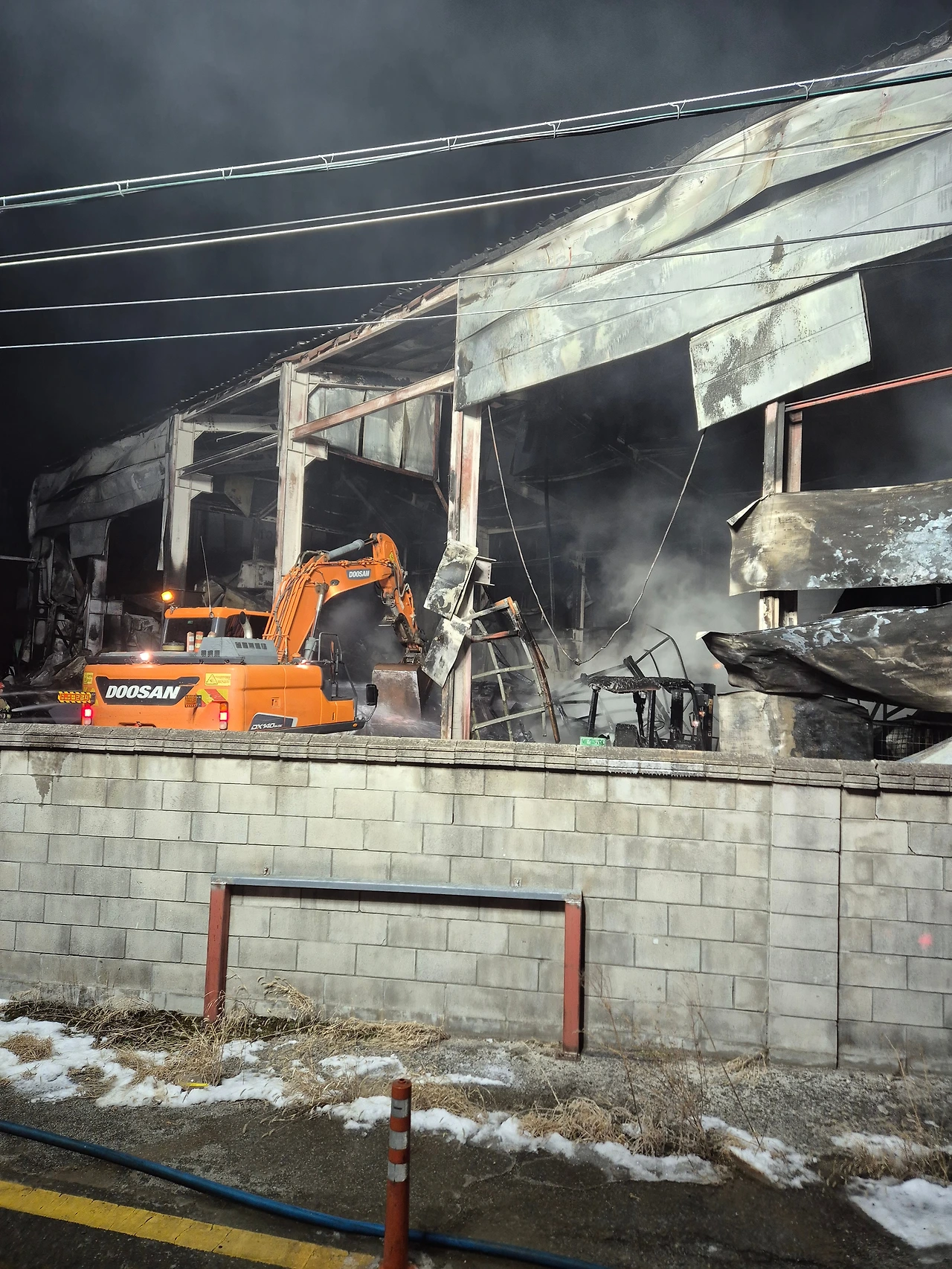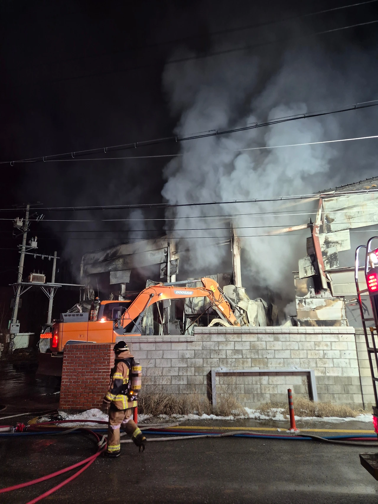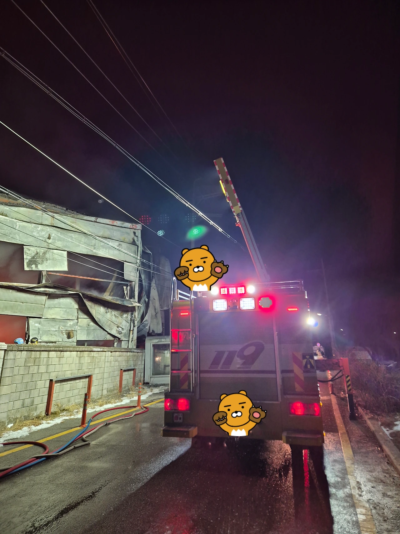 현장에 도착한 후 지휘관에게 차량 배치할 곳을 물어본 뒤 장애물을 피해 차량 양 옆을 아우트리거로 지지했습니다. 그 후 전선을 피해 조명대를 위로 높이 올리고 불이 난 곳으로 조명 위치를 조절합니다. 말로 하면 쉬워 보이지만 현장에서 하는 건 그리 쉽지 않습니다. 조연차에는 경유로 돌아가는 6~700kg 정도 무게의 발전기가 있어서 주변에 전기를 공급하거나 조명에 필요한 전기를 충분히 감당합니다. 저는 직접 화재현장에서 불과 마주하는 진압대원과는 달리 이 차량의 전반적인 관리와 조작, 운전만 하면 됩니다. 공기호흡기를 메고 현장으로 들어가는 진압대원보다 몸은 편하지만 대신 추위와 싸워야 합니다. 화재 현장 주변에는 얼어붙은 소방용수로 인해 길이 미끄러웠고 수시로 주변을 체크하는 안전관(현장에서 안전을 담당)이나 지휘관, 진압대원, 경찰(화재현장에 동시 출동해서 주로 인원 통제 및 초동 조사 담당)이 돌아다녔습니다. 모두들 열심히 일하는데 혼자만 차 안으로 들어가 있을 수 없었습니다. 8시쯤 출동 후 자정이 다 되는 시간까지 밖에서 왔다 갔다 하며 차량 관리(발전기 이상 여부, 경유 소모량 체크, 차량 이상 소음 확인, 조명붐대나 아우트리거 이상 여부 확인 글로 쓰면 많지만 막상 1~2분이면 끝납니다)도 하고 나머지 시간은 추위와 싸우며 속으로 덜덜 떨고 있었습니다. 영하 7~8도의 날씨라 가만히 서 있으면 손발이 시리고 몸도 떨렸습니다. 추위를 참으려고 핫팩의 도움을 받았지만 추울 때마다 이를 악물게 되는 건 어쩔 수 없었습니다.