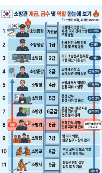 소방관의 계급순서입니다. 소방사(9급)→소방교(8급)→소방장(7급)→소방위(6급 을, 센터의 팀장)→소방경(6급 갑, 소방서 각 과의 팀장 또는 센터장)→소방령(5급, 소방서 과장)→소방정(4급, 소방서장). 입사한지 15년하고 한 달이 지나서 작년에 소방위가 됐습니다. 동기들과 같은 속도로 진급을 해서 늦게 진급한 편은 아닙니다만 그렇다고 빨리 진급하지도 않았습니다. 저는 정년까지 무사히 소방관 생활을 하는 게 목표인 사람이라 진급은 마음속에서 내려놓은 지 오래입니다. 제가 입사할 때는 소방위 계급이면 간부공무원으로 대접받는 위치였습니다. 당시 소방위 팀장님 한 마디면 막내인 저는 설설 기어야 했었죠. 그러나 점차 승진속도가 빨라지고 승진 자리도 늘어남에 따라 소방위, 소방경들이 점차 많아지기 시작했습니다. 그래서 예전만큼은 아니지만 (흔히 말하는 위에서 누르고 아래에서 치이는) 조직에서 허리 역할을 하는 계급이라고 보시면 됩니다.