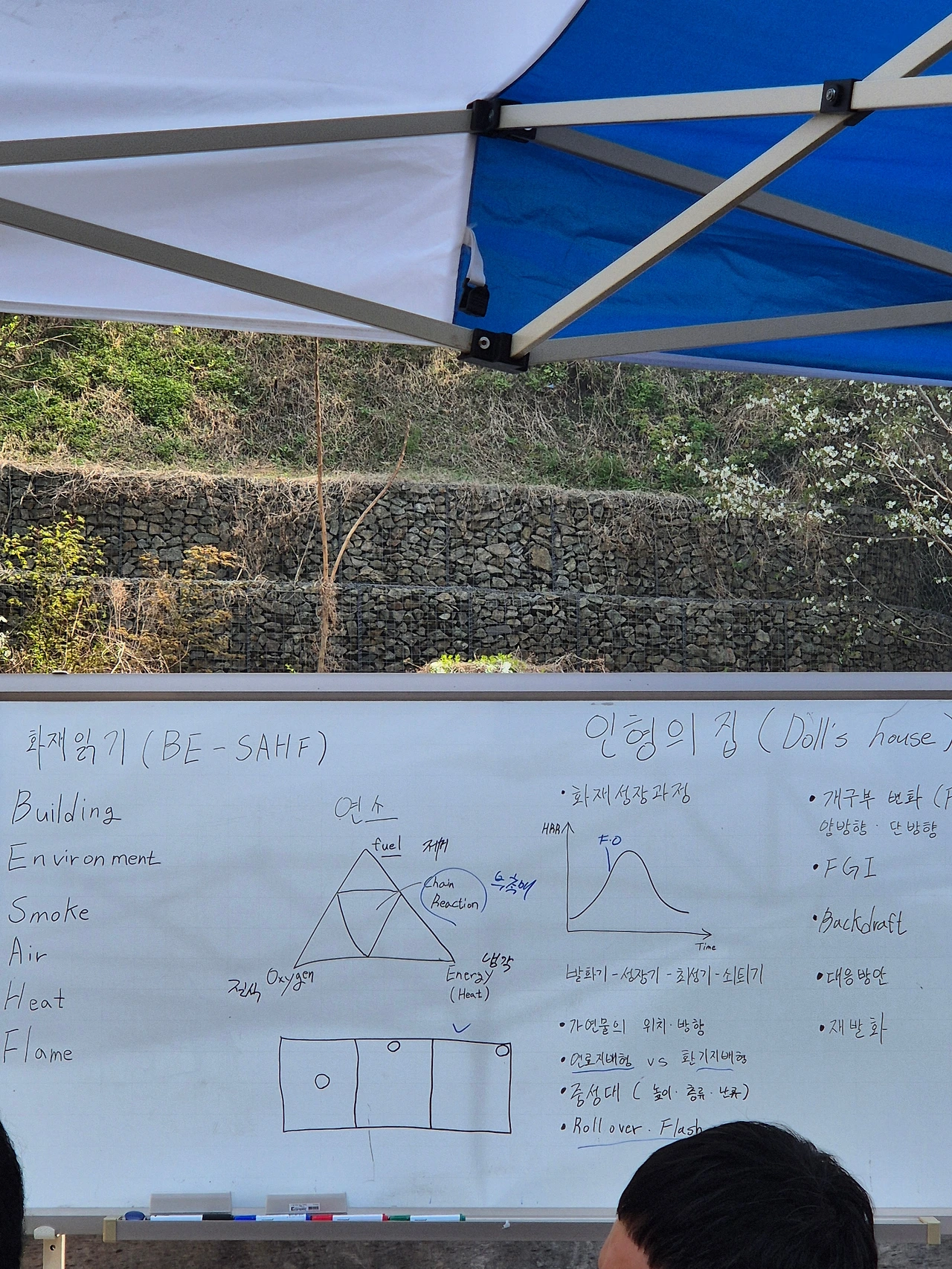 2년 전에 배웠던 실물화재 연습과 거의 내용은 비슷했습니다. 다만 시간이 흐르며 머릿속에서 흐려졌던 걸 되새겨주는 강의시간이었습니다. 화재가 나면 건물(Building)과 주변 환경(Environment)은 이미 주어진 것이라 소방관인 우리가 통제할 수 없지만 연기(Smoke), 공기(Air), 열(Heat), 불꽃(Flame)은 제어할 수 있는 변수니 이걸 활용해 피해를 최소화하고 불을 끄는데 활용해야 한다라는 강의였습니다. 복싱으로 말하자면 무식하게 힘이나 기술만 뛰어난 선수가 아니라 몸, 마음, 경기장 상태, 상대방의 기술 분석등을 통해 효과적으로 이기는 방법을 고민하는 수업이었습니다.