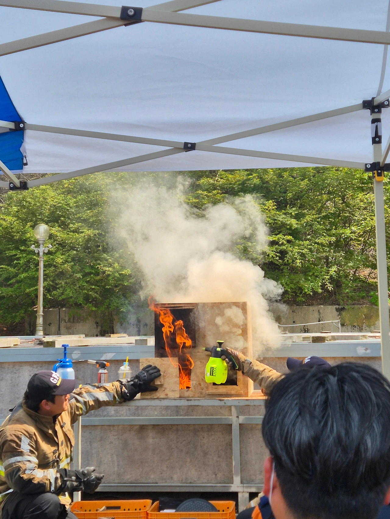 다만 한 가지 몸으로 뛰는 체험이 있었으니 소위 미로 체험이라 부르는 고층건축물 화재 세트에서 정해진 미로를 뚫고 나오는 일이었습니다. 3명이 한 조를 이루어 들어갔습니다. 신임 소방공무원 교육처럼 화재를 가정한 열이나 연기도 없었고 앞을 가려 시각이 막혀있는 상황은 아니었습니다. 그래도 오랜만에 방화복 풀세트에다 공기호흡기까지 장착하니 절로 긴장되며 호흡이 살짝 가빠졌습니다. 훈련은 훈련이니까요. 낮은 포복으로 기어가고 장애물을 통과하고 좁은 곳을 들어가기 위해 잘 메고 있던 공기호흡기를 풀어서 밀고 들어가고 마지막에는 1.2m 정도의 장애물을 넘어서 10분정도의 체험은 끝이 났습니다. 짧은 시간이었지만 옷이 흠뻑 젖었고 메고 있던 공기호흡기의 공기양도 꽤나 줄어들었습니다. 몸이 힘들어지니 그제야 15년 전 이곳에서 신임 소방관 훈련을 받던 기억이 새록새록 스쳐 지나가기 시작했습니다.