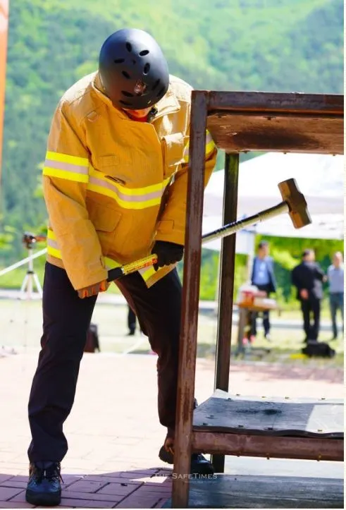 점심 먹고 1시부터는 최강소방관 경기를 똑같이 따라 하는 시간이었다. 호스 끌고 달리기를 하면 일단 숨이 가빠졌다. 65mm 호스 1벌은 약 10kg이다. 이게 8벌이 연결된 채 바닥에 있고 출발 신호와 함께 그 호스 끝을 어깨에 메고 뛴다. 처음엔 가볍지만 뛰어갈수록 길게 펴진 호스의 무게가 점차 느껴진다. 점점 어깨는 무거워지고 숨소리는 거칠어진다. 50m 지점에 호스를 놔두고 바로 10여 m를 가볍게 뛰어간다. 해머 치기 50회 차례다. 90cm 크기로 된 박스의 천장과 바닥을 차례로 치는 게 1회다. 이걸 50번 반복해야 한다. 해머는 약 6kg인데 생각보다 묵직하다. 박자에 맞춰 치면 일정한 리듬이 생기며 듣기 좋은 소리가 난다. 50회를 치는데 빠르면 30초 정도 걸린다. 하지만 해머 치기를 연습하는 동안엔 장갑을 끼고 연습했어도 해머를 쥐는 부분의 양손바닥 껍질이 다 벗겨져 한동안 쓰라림을 느껴야 했다.