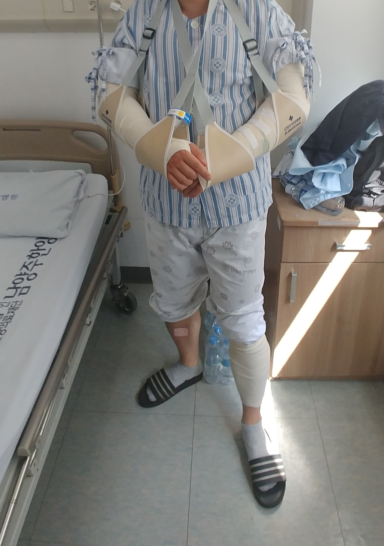 그때가 시작이었다. 로드 자전거 3달 → MTB로 바꾼 지 얼마 안 되어 한창 재미있게 탈 때였다. 2018. 8월 어느 날, 주간 근무(오전 9시~오후 18시)를 마치고 같이 구급차를 타는 후배들과 저녁을 먹었다. 한창 내린 집중호우가 끝난 다음 날이라 홀가분한 마음도 있었다. 센터 사무실에 자전거를 놔두고 온 상태라 후배 차를 타고 다시 사무실로 돌아왔다. 한사코 후배가 만류를 했다. 이제야 비가 그쳤으니 자전거는 놔두고 가라는 얘기였다. 난 괜찮다며 천천히 조심히 갈 테니 너희들 먼저 가라고 하고는 자전거를 끌고 나갔다. 사무실 뒤편에 바로 자전거 도로가 있어서 나가는데 30초면 충분했다. 그리고 내리막길을 가는데 어라, 갑자기 모래와 자갈로 길바닥이 난장판이 되어 있었다. 한창 내리막길에서 내려가는 상태라 속도는 35km/h 정도였을 텐데 안 다치려면 그 상태 그대로 내려가야 했다. 그런데 나도 모르게 미끄러지니까 반사적으로 양손 모두 브레이크를 잡았다. 빠른 속도로 내려가는 중 브레이크를 잡은 결과 뒷바퀴가 공중으로 들렸고 난 그 상태로 180도 회전하며 공중에 2~3m쯤 떠 있었다. 그리고 바닥으로 떨어지면서 양 팔꿈치가 부러지고 이마와 양쪽 다리에 찰과상을 입었다.
