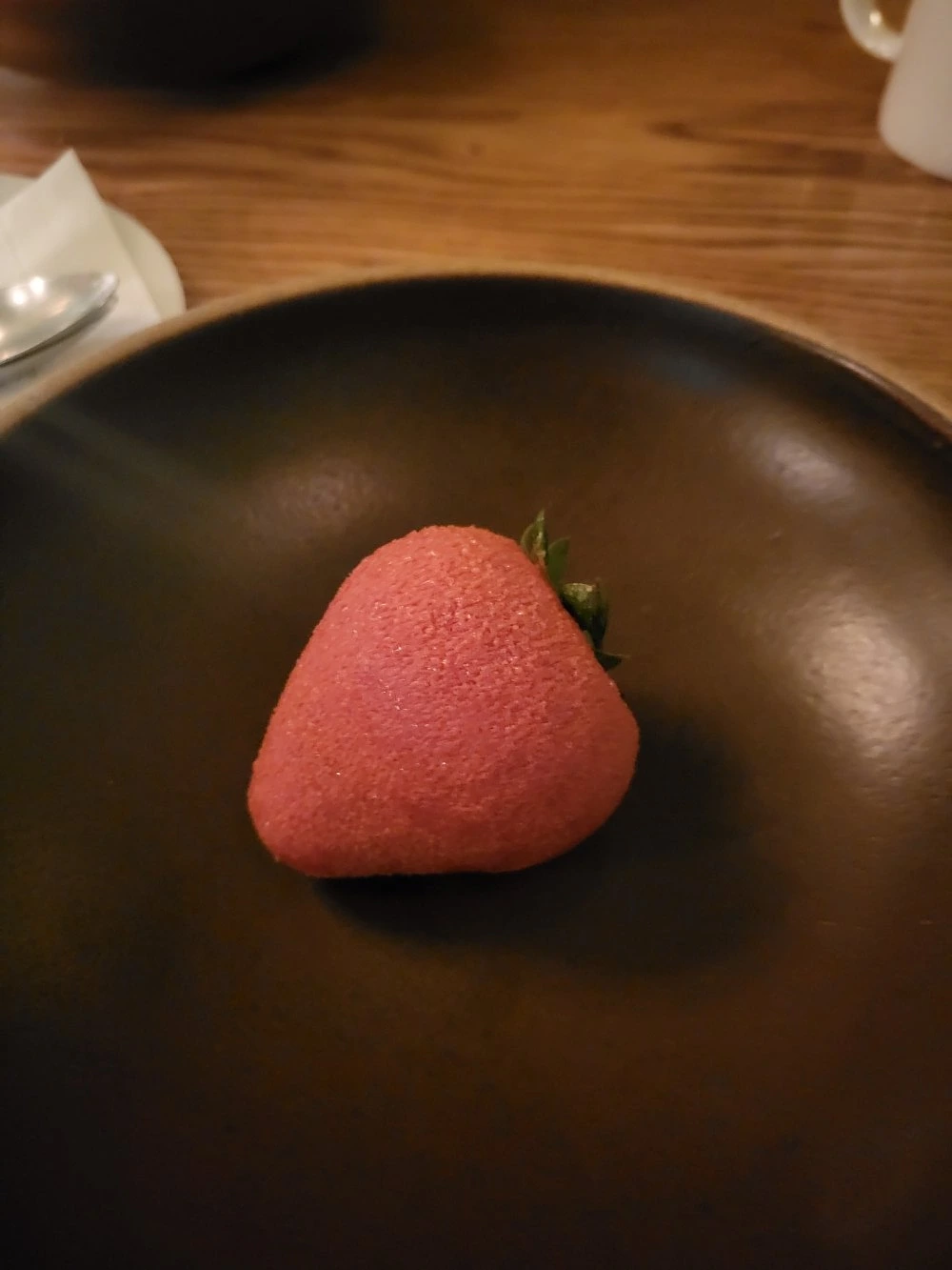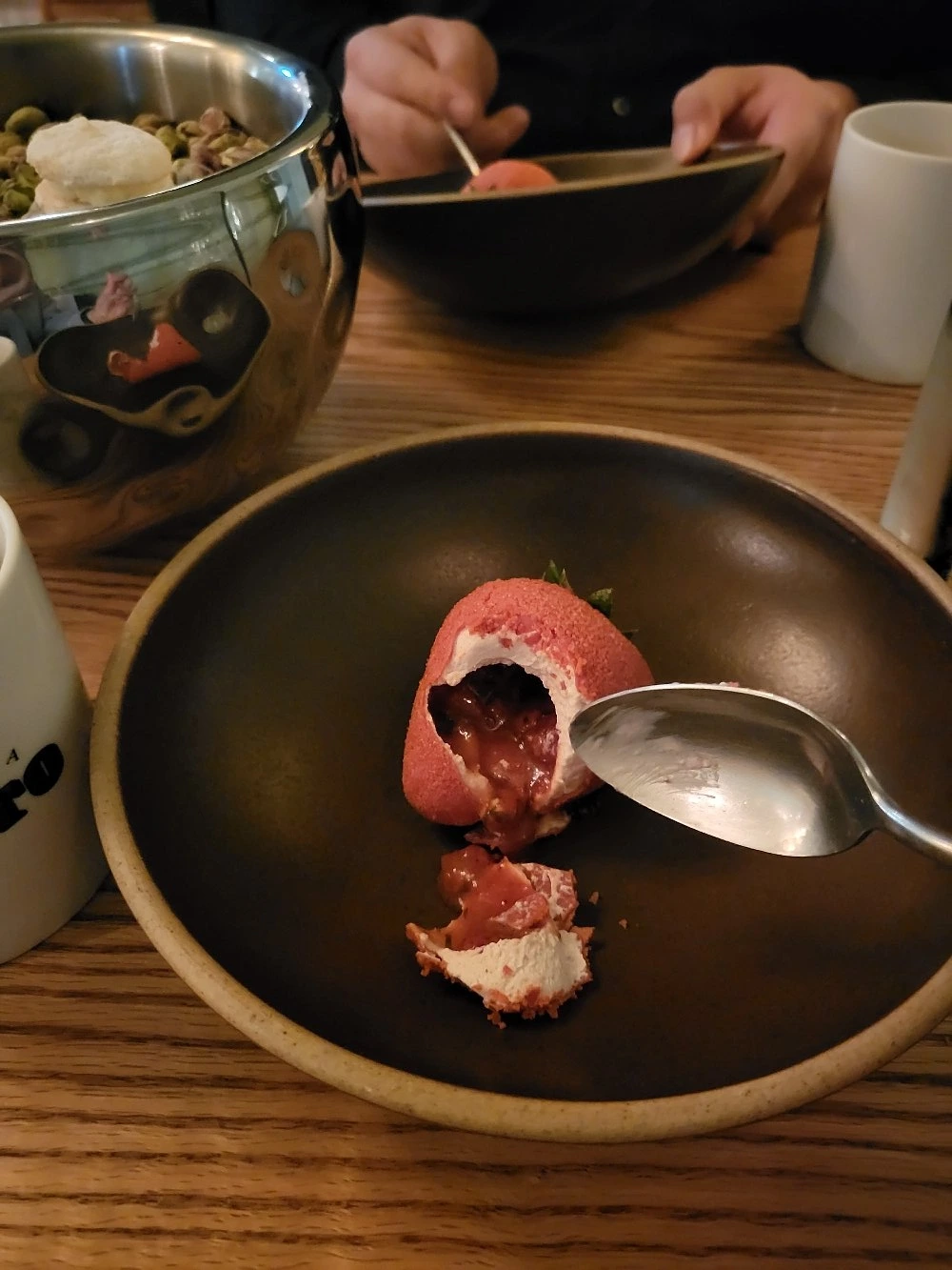 근데 깨보니 그 안에 뭔가가 또 있다. 이게 너무너무 맛있다. 딸긴데 크리미하게 달달해. 그냥 달달한 게 아니고 기분좋게 입맛을 마무리하며 달달하다. 뭐지. 아 우울할 때 왜 달달한 거 먹으라고 하는지 알 것 같은 위로의 달달함이었다.