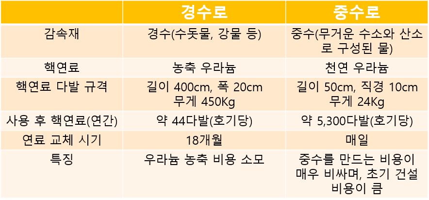 ③ 중수로 : 중수를 감속재, 냉각재로 사용하는 원자로. 연료 농축 불필요. 초기 건설 비용이 높고 핵폐기물이 대량 발생.