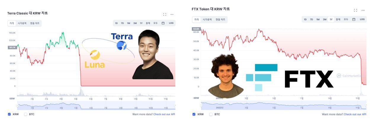 암호화폐 시장의 신뢰도를 회복 불가능할 수준으로 만든 두 암호화폐가 있다. 여기엔 불과 지난주 세계 경제에 엄청난 파급을 미쳤던 암호화폐도 포함된다. 바로 루나코인과 FTT코인이다. 두 가지 코인은 모두 시장 내 자산가치 10위 안에 들던, 말 그대로 암호화폐를 조금 안다 싶은 사람이라면 누구든지 알고, 성장성 있고, 규모가 있던, 암호화폐였다. 그러나 현재 이 두 가지 코인은 암호화폐 시장의 권위를 바닥까지 떨어뜨린 주범이 되었다. 시장 내 이들의 가치는 제로가 되었다. 수십 조 달러의 가치를 지녔던 코인의 자산규모가 0 달러가 되면서 전 세계에 많은 투자자들이 갖고 있던 암호화폐는 전부 쓰레기가 되었다. 아니, 불에 태우면 최소한 열에너지라도 발생시키는 쓰레기보다도 못한 존재가 되었다. 안 그래도 이미 가치가 많이 떨어졌던 코인 시장에서 말 그대로 엎친데 덮친 격이었다. 물론, 두 가지 사건 이외에도 이미 엄청나게 많은 스캠코인들이 만들어지고 없어졌다. 그러나 자산 규모나 파급력 면에서 이 두 가지 코인의 가치 폭락 사건에는 비할바가 못 되었다. 시장의 거품이 걷히고, 금리는 올라가고, 그 와중에 시장을 대표하던 두 가지 코인은 뱅크런으로 나가떨어지는 상황이니, 코인 시장은 당분간 회복세로 전환하긴 쉽지 않은 형국이 된 셈이다.
