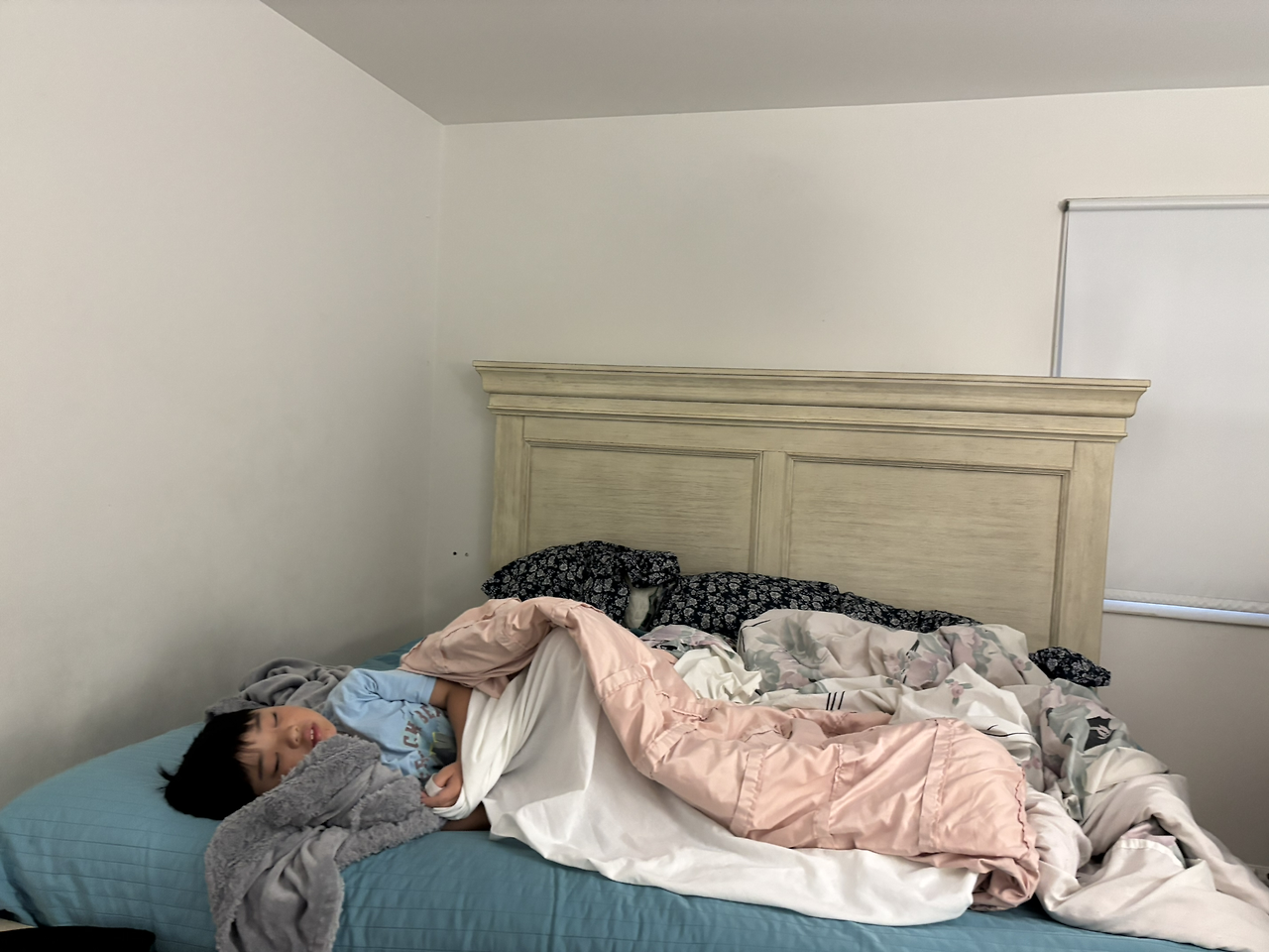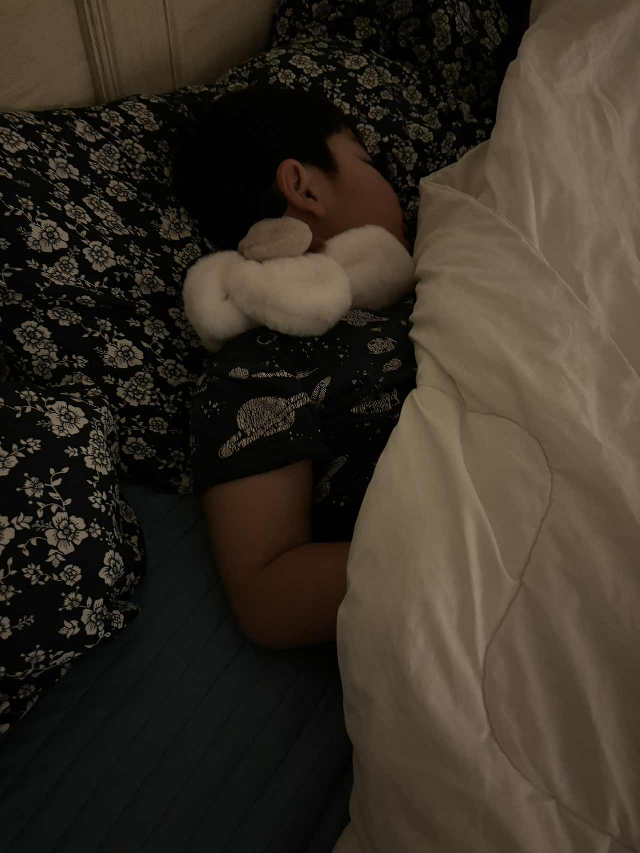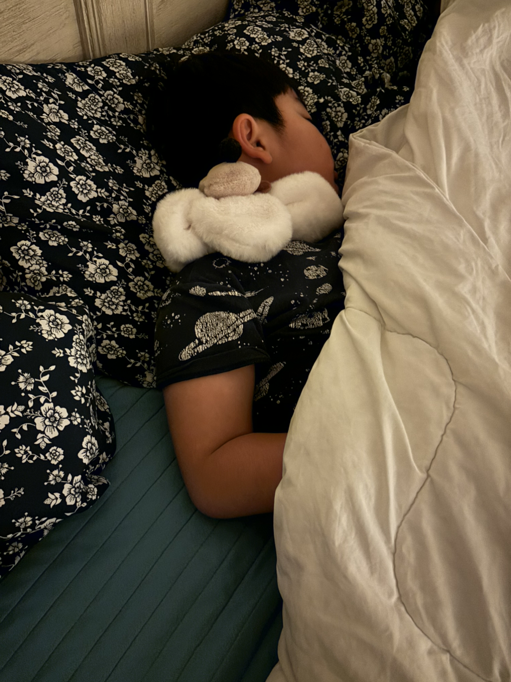 예준이도 아빠처럼 침대에 가로로 누워 자고 있었거든요!