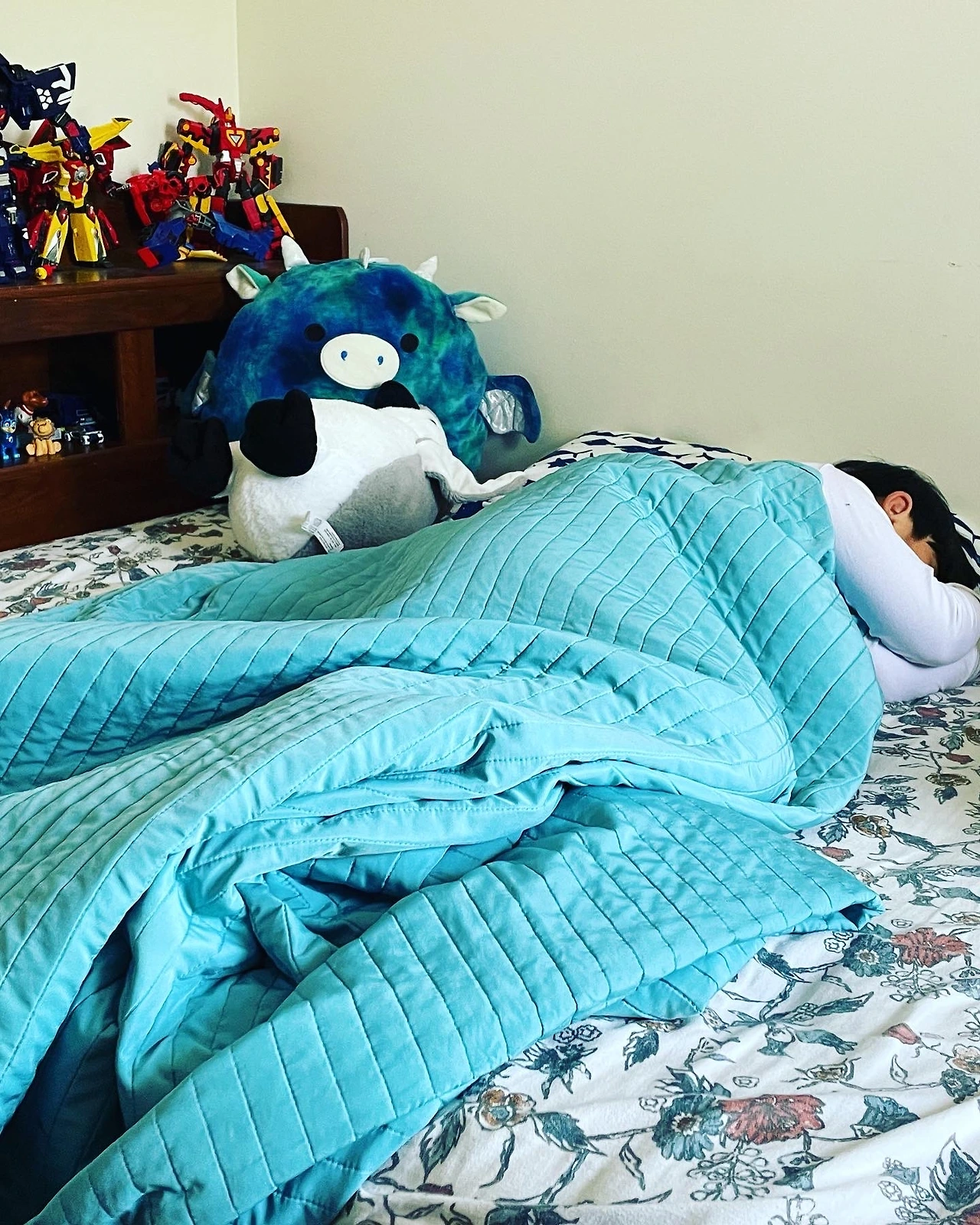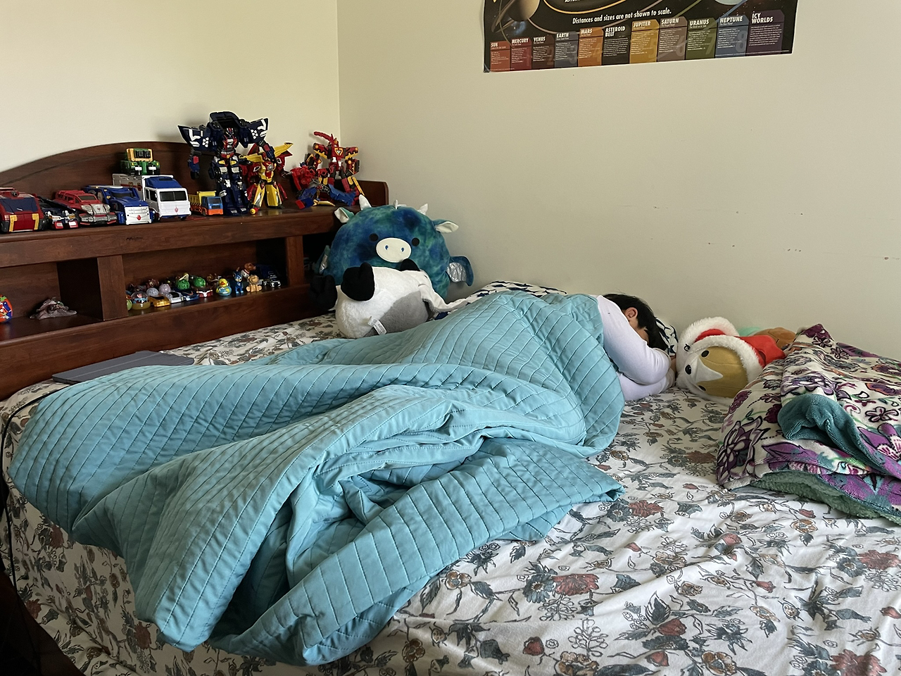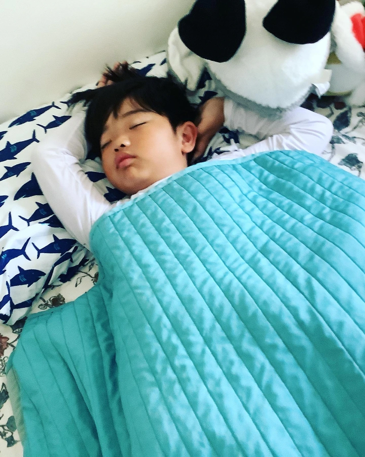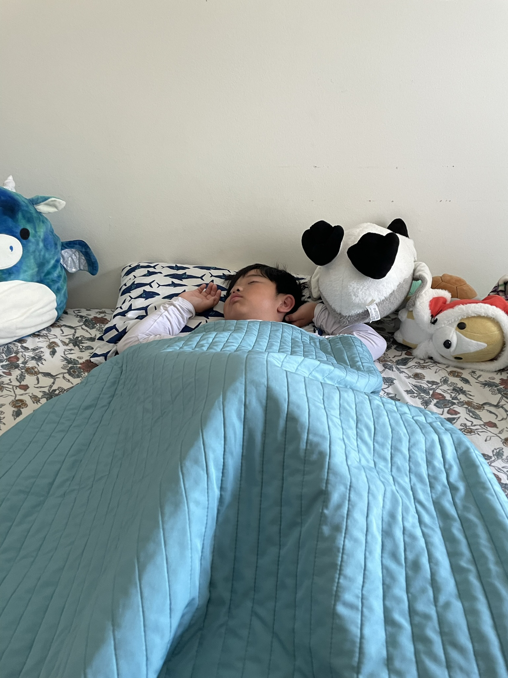 예준이도 아빠처럼 침대에 가로로 누워 자고 있었거든요!