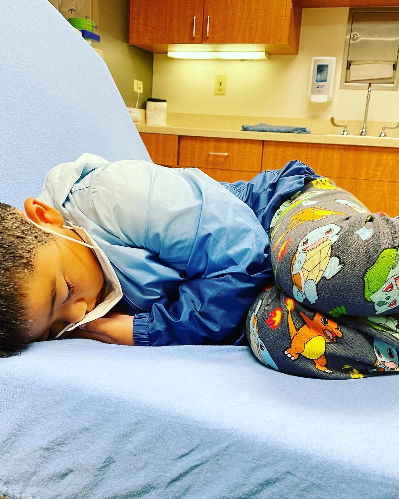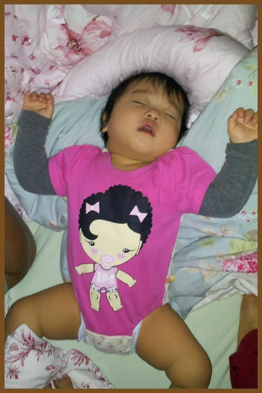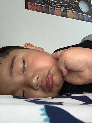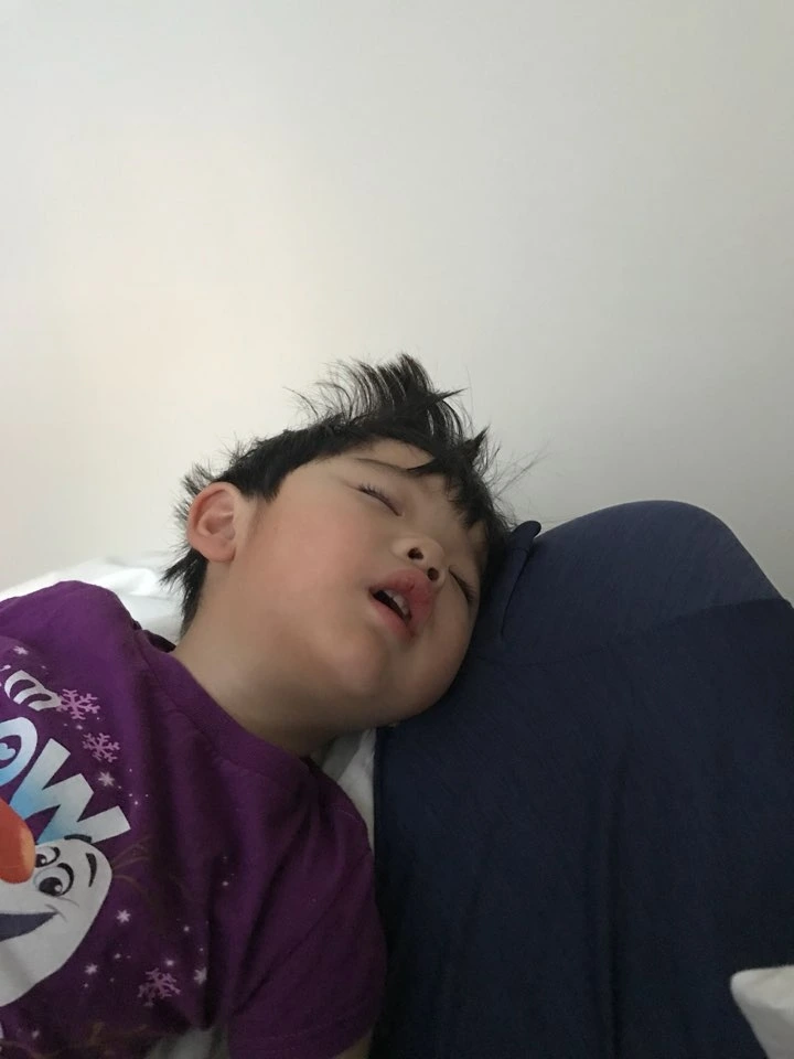 베개 대신 침대 벽을 베고 쿨쿨 자고 있는 예준이.
