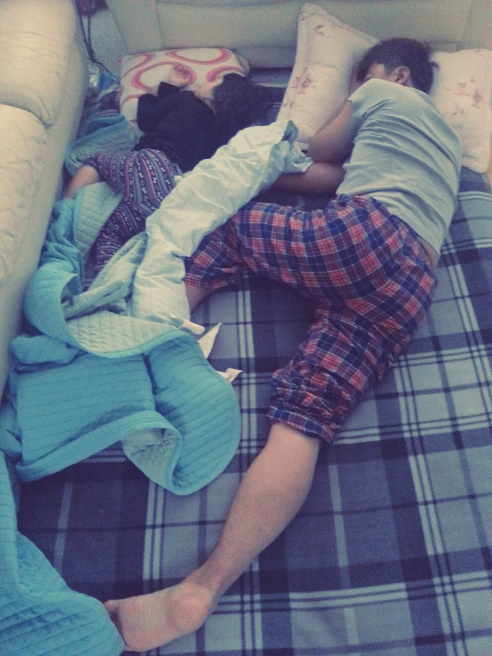 옆을 보니, 아빠가 이불 위에 머리를 가로로 두고