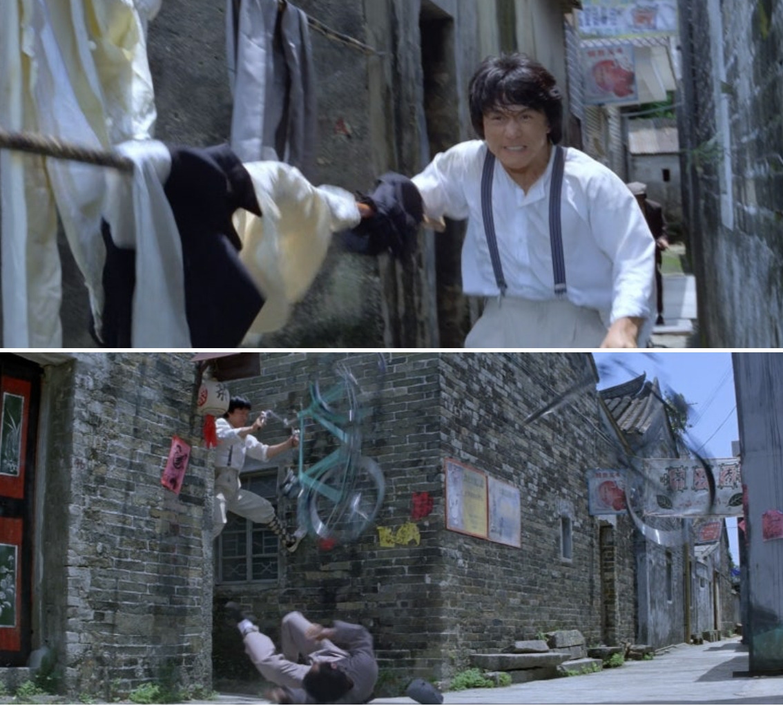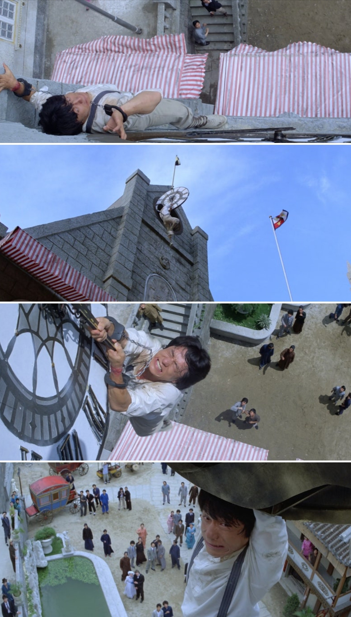 이 영화의 백미는 뭐니뭐니해도 시계탑에서 떨어지는 장면이다. 좁은 탑 꼭대기에서 밧줄 하나에 의지해 아래로 떨어지며, 성룡은 비명을 지르지도 않고 온몸으로 스릴을 표현해낸다. 이 장면은 단순한 액션을 넘어서 ‘실제로 했다’는 사실에서 전율을 준다. 대역 없이, 그것도 세 번이나 촬영을 감행한 성룡. 그 광기어린 집념은 관객으로 하여금 숨을 멎게 만들었고, 이후 내가 본 어떤 액션 영화도 이 장면을 능가할 수 없었다.