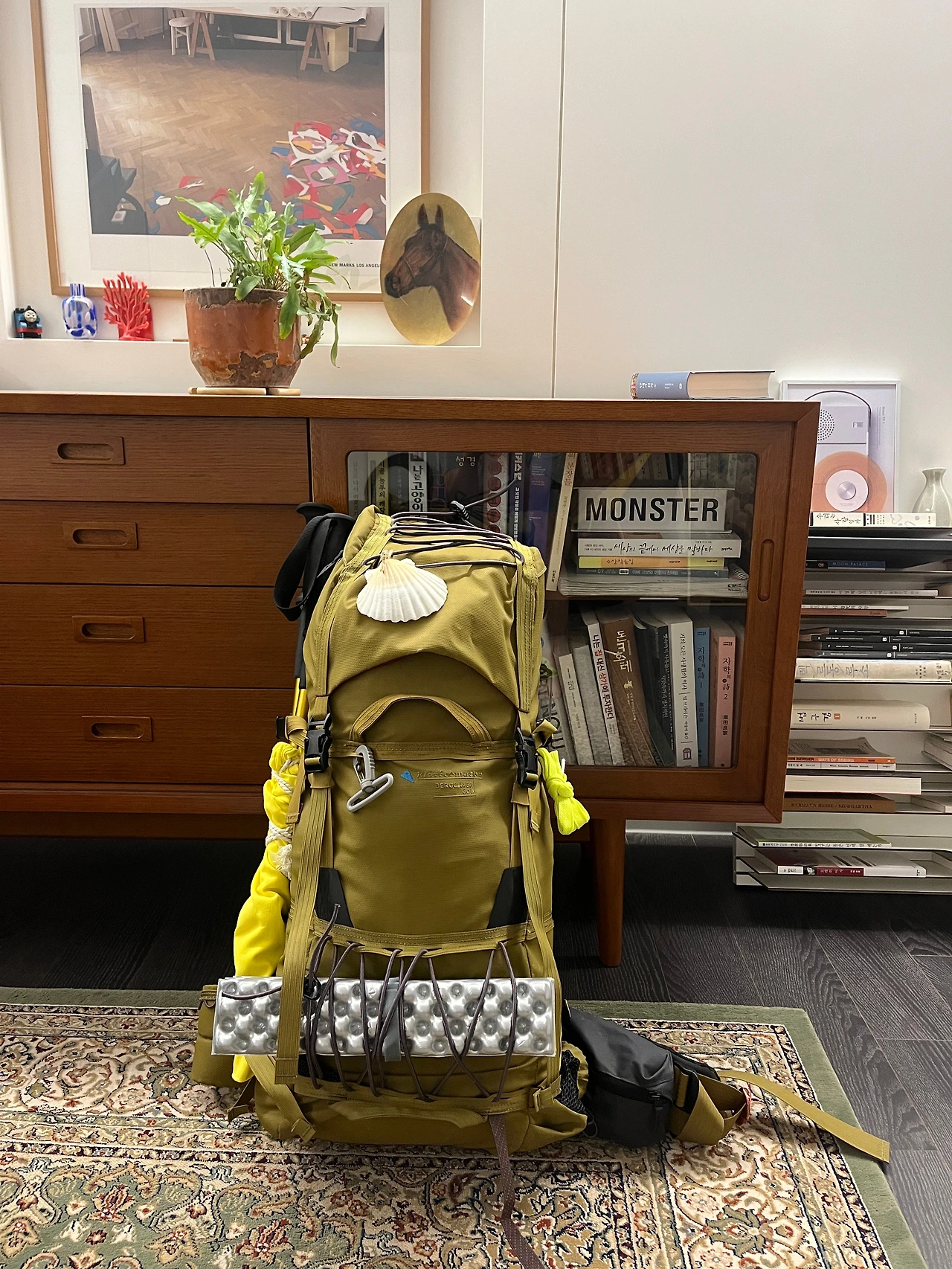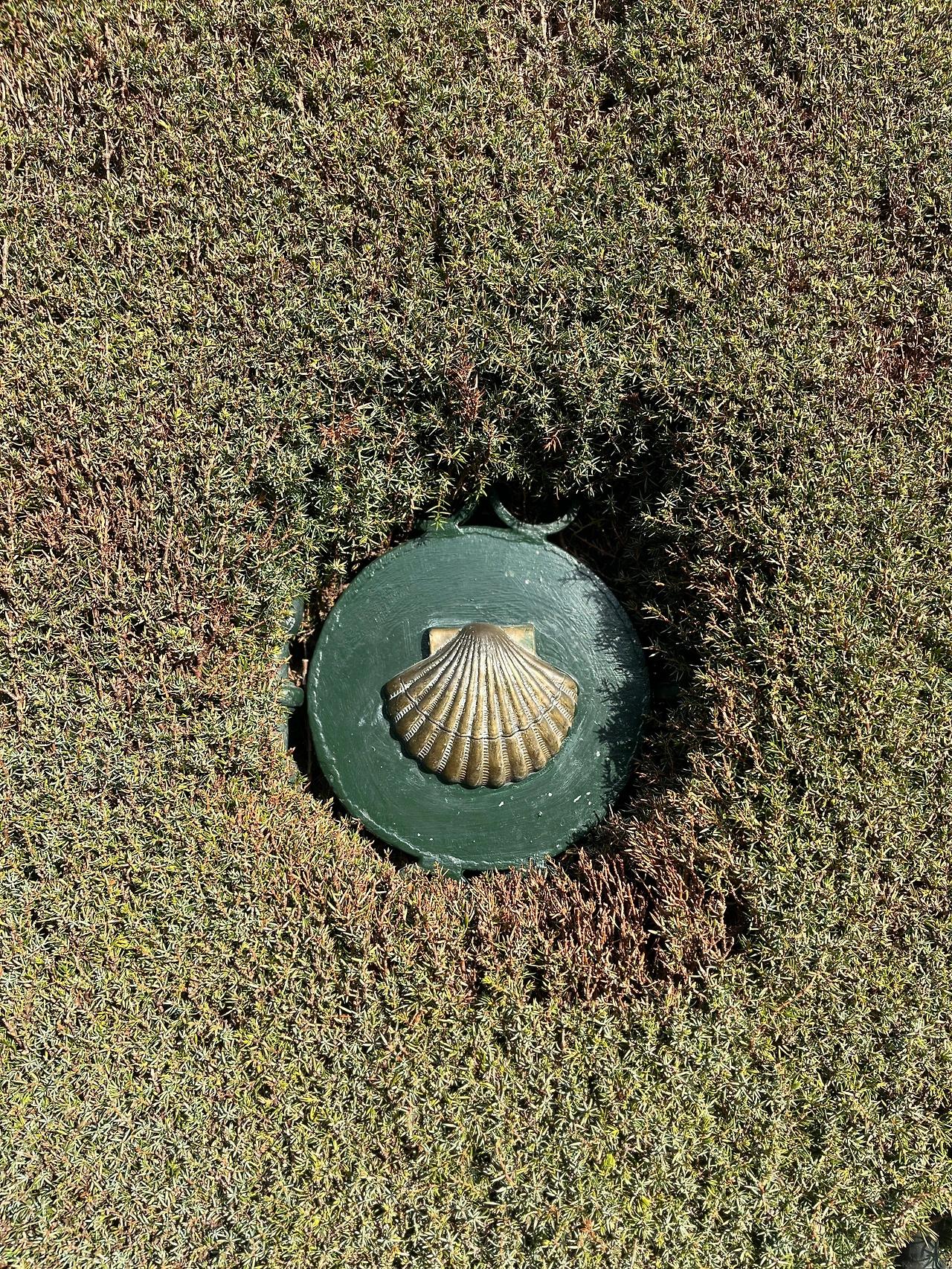 배낭을 짊어진 남자는 두개의 가리비를 가만히 바라본다.