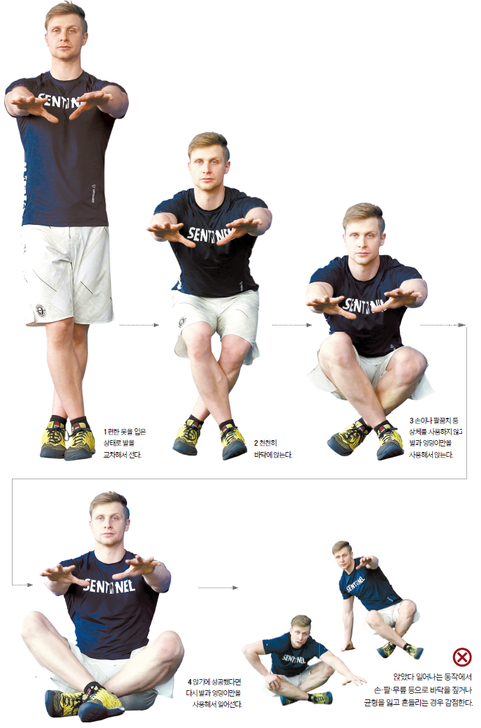 간단히 설명하면 먼저 신발을 벗고 편한 옷을 입은 상태로 발을 교차해서 선다(사진 1). 이 상태에서 천천히 바닥에 앉는데 이때 손이나 팔꿈치 등 상체를 사용하지 않고 발과 엉덩이만을 사용해서 앉는다(사진 2, 3, 4).