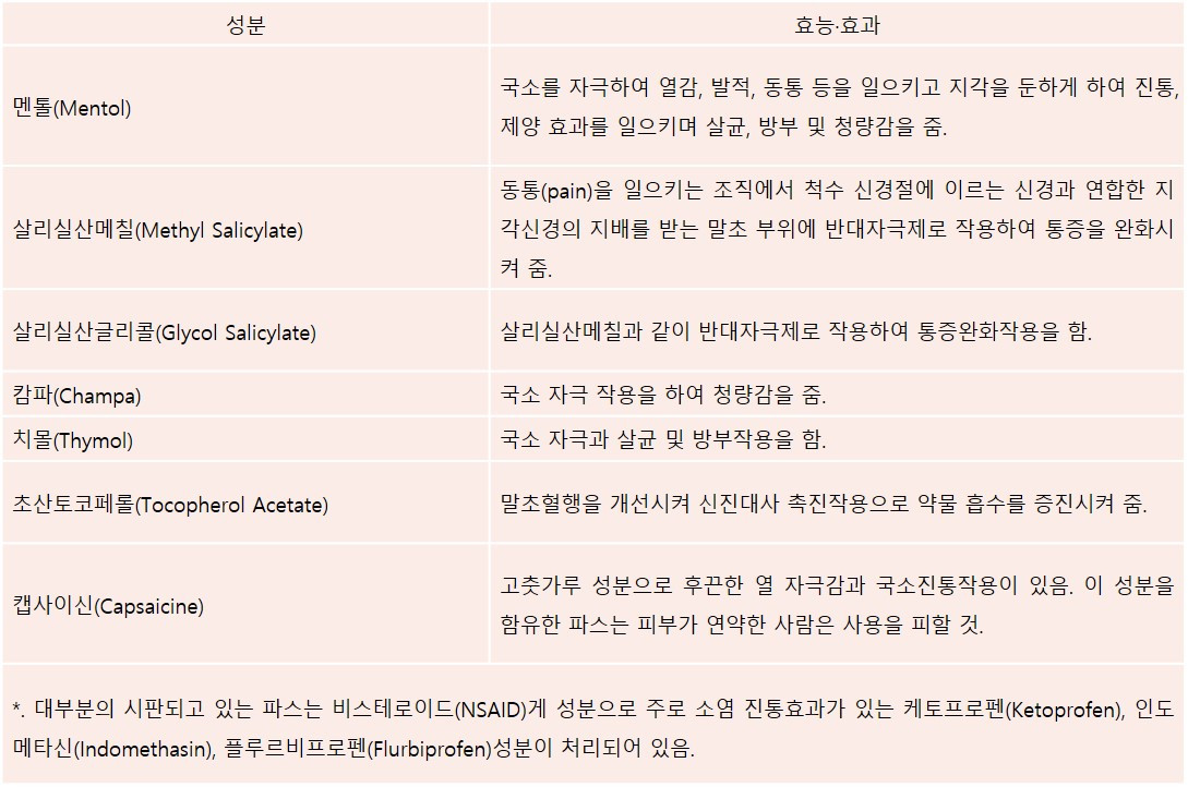 위의 표는 대표적 파스 성분 표시 중 피부를 통해 침투하여 생리학적 작용을 하는 물질들이다. 추가적으로 본사에서 제작, 제공하는 (주)트레이닝랩 스포츠 쿨젤은 멘톨, 페퍼민트 오일, 알로에베라, 위치하젤 잎, 캄파 등의 인체 무해한 천연물 성분을 주로 포함하고 있다.