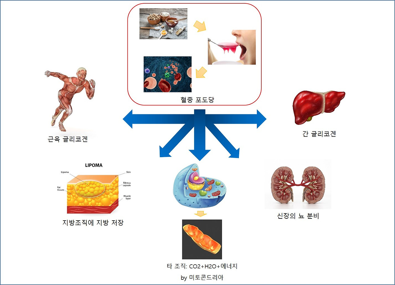 • 혈중 포도당의 일부는 기초대사를 담당하는 뇌와 신경계의 에너지원으로 우선 사용되고, 나머지는 글리코겐으로 합성되어, 인체를 구성하는 근육과 내장기관의 활동을 위한 에너지원 확보의 목적으로 간과 근육에 저장된다.