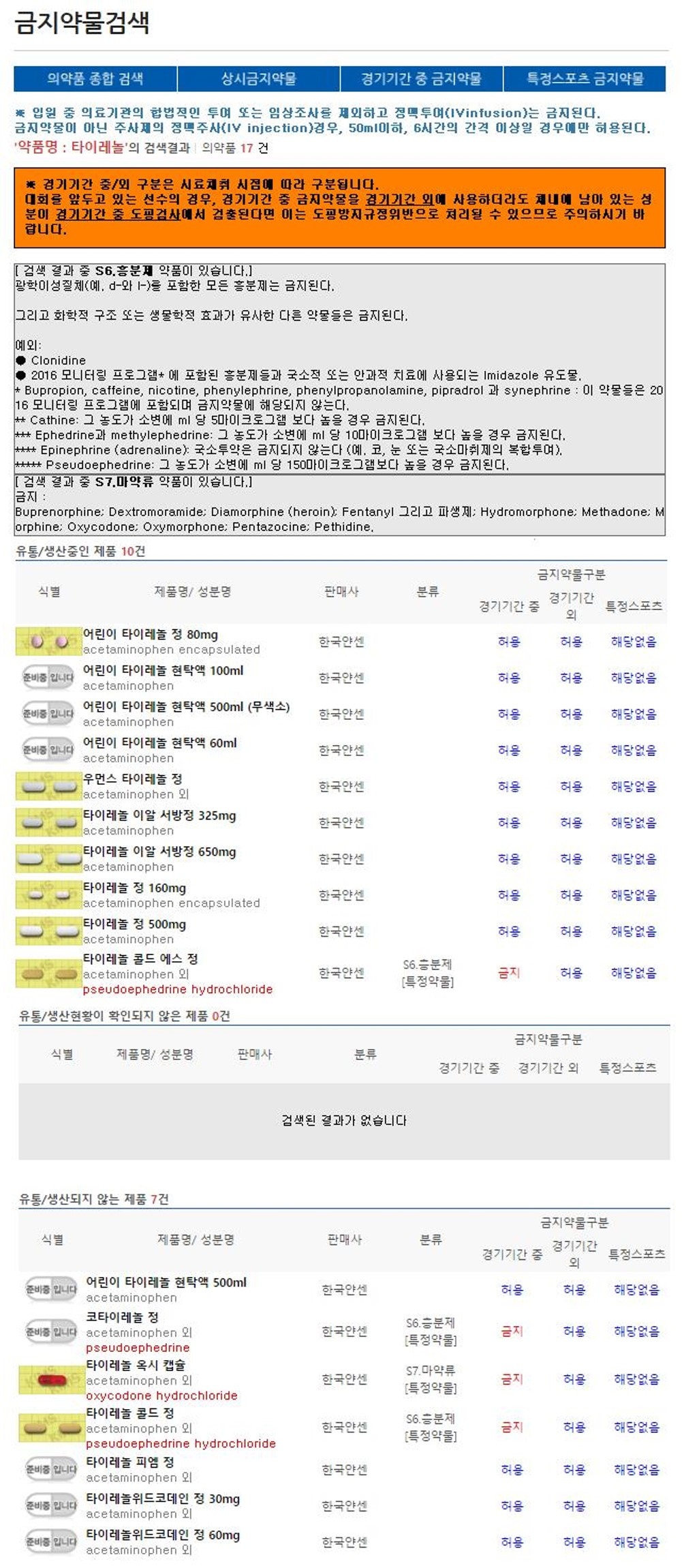 여기에 타이레놀을 입력하여 검색해보자. 필자의 이전 글에서 소개한 바와 같이 타이레놀 중 타이레놀 콜드 에스 정은 경기 기간 중 금지 약물 목록에 속한다는 사실이 기억나는가? 이를 염두에 두고 아래의 결과를 한번 살펴보자.