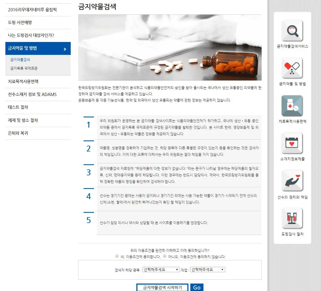 화면 하단의 이용조건 동의와 자신이 확인하고자 하는 해당 종목의 선택, 그리고 선수인지 아니면 경기단체 관계자 혹은 지도자인지에 따른 자신의 신분을 선택한 후 금지약물 검색 시작하기 버튼을 누른다. 해당 종목의 선택이 필요한 이유는 종목에 따라 경기 기간 중 또는 경기 기간 외 금지 약물이 상이한 경우가 있기 때문이다.