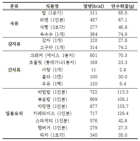 고탄수화물 식이에서 참고할 수 있는 식품 품목과 함량을 보면,