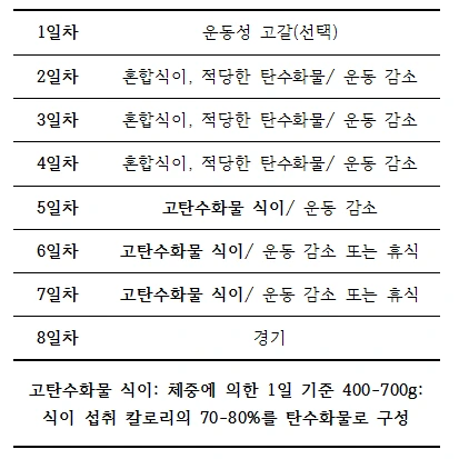 피로를 지연시키기 위해 간 및 근육의 글리코겐 함량을 증가시키기 위한 계획된 식이 방법을 말한다.